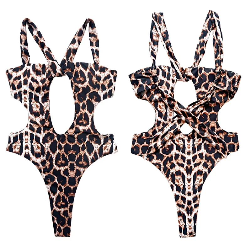 New Women Bikini Leopard Print Solid Color Halter Strap Swimsuit Tight-Fitting Hollow-Out Sexy One-Piece Swimsuit