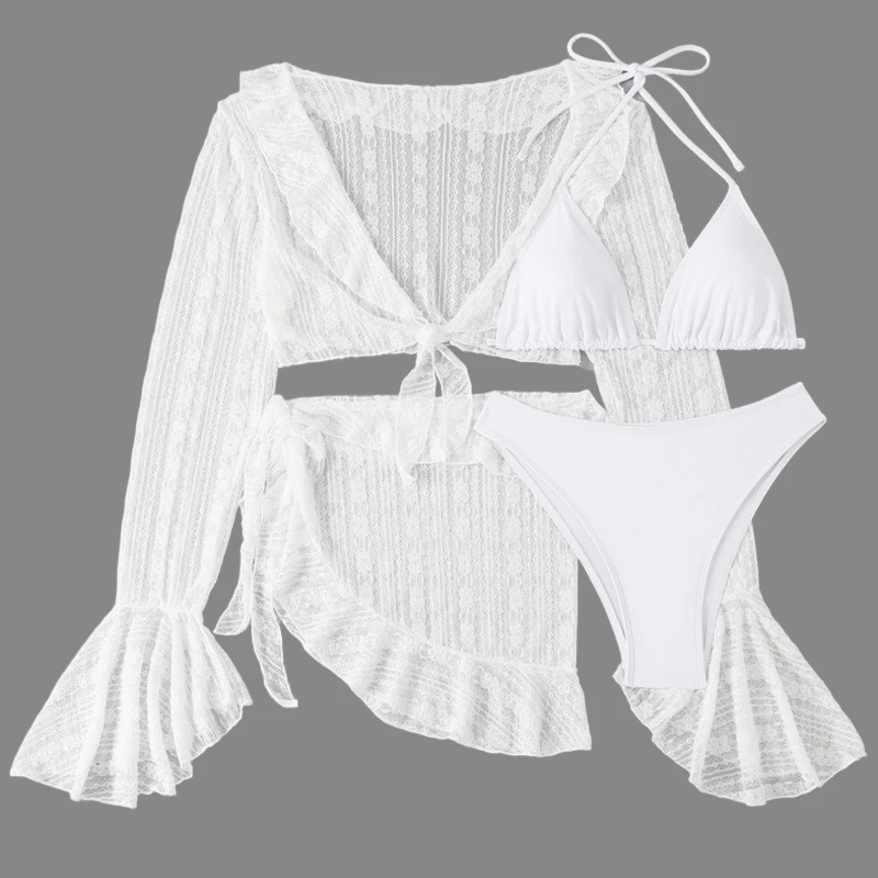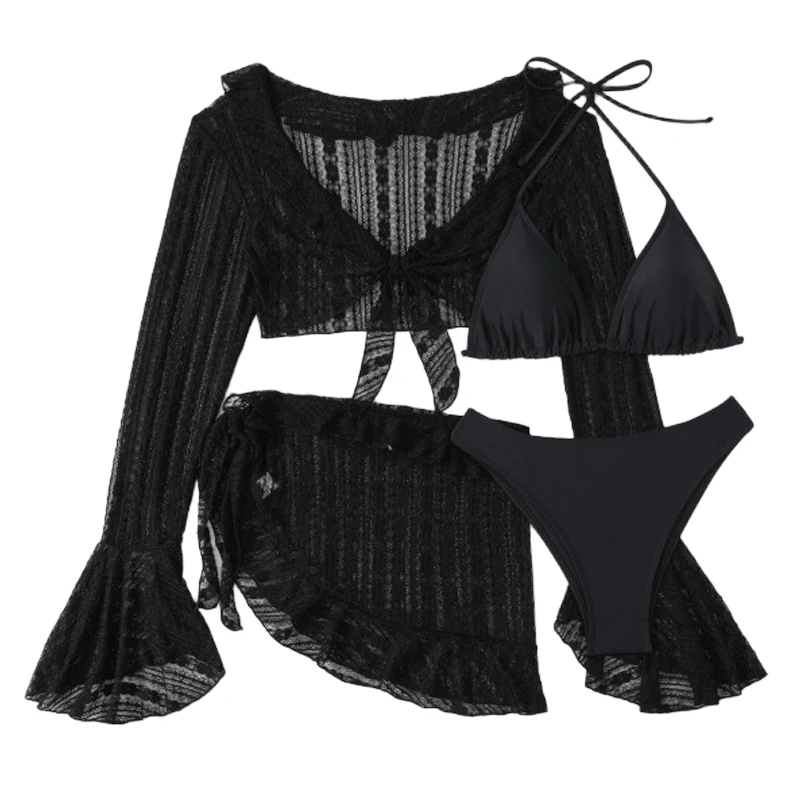 Women's Plus Size Brazilian Four-Piece Bikini Set Solid Color Mesh Long Sleeve Anti-UV Quick Dry Breathable Reversible