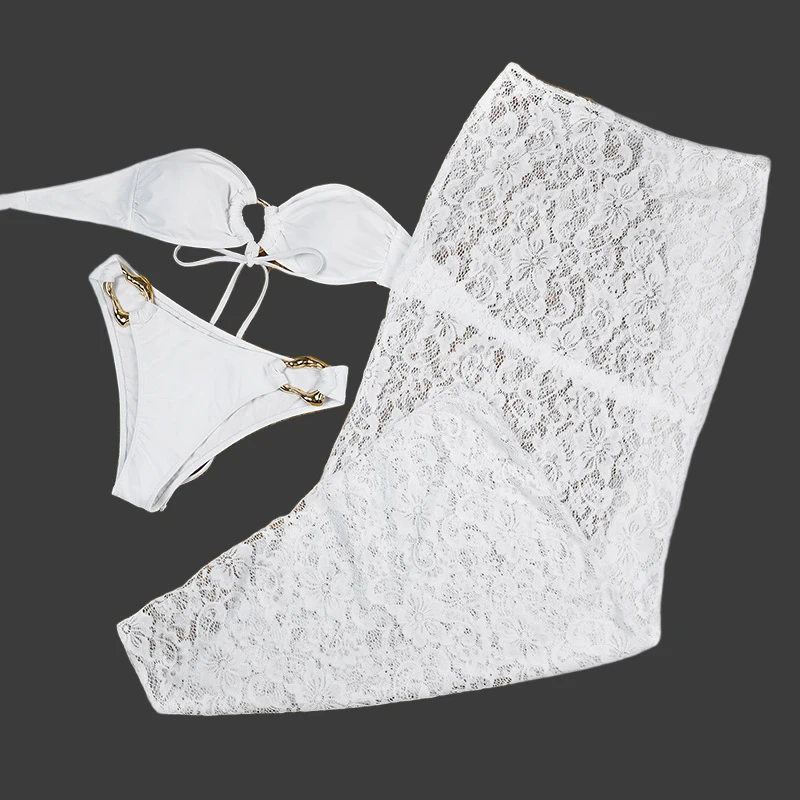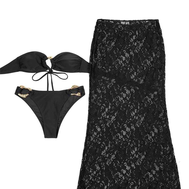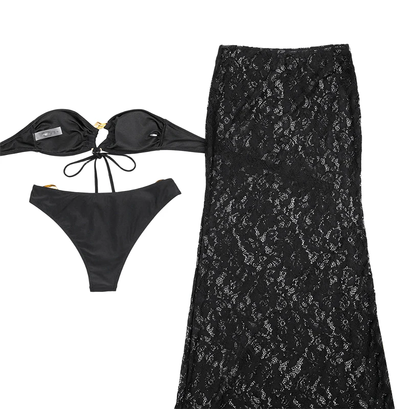 Trendy Sexy Three-Piece Bikini Set Metal Ring V-neck Top Ruffles Lace Cover-Up Flowy Skirt Breathable 100% Polyester Front Women