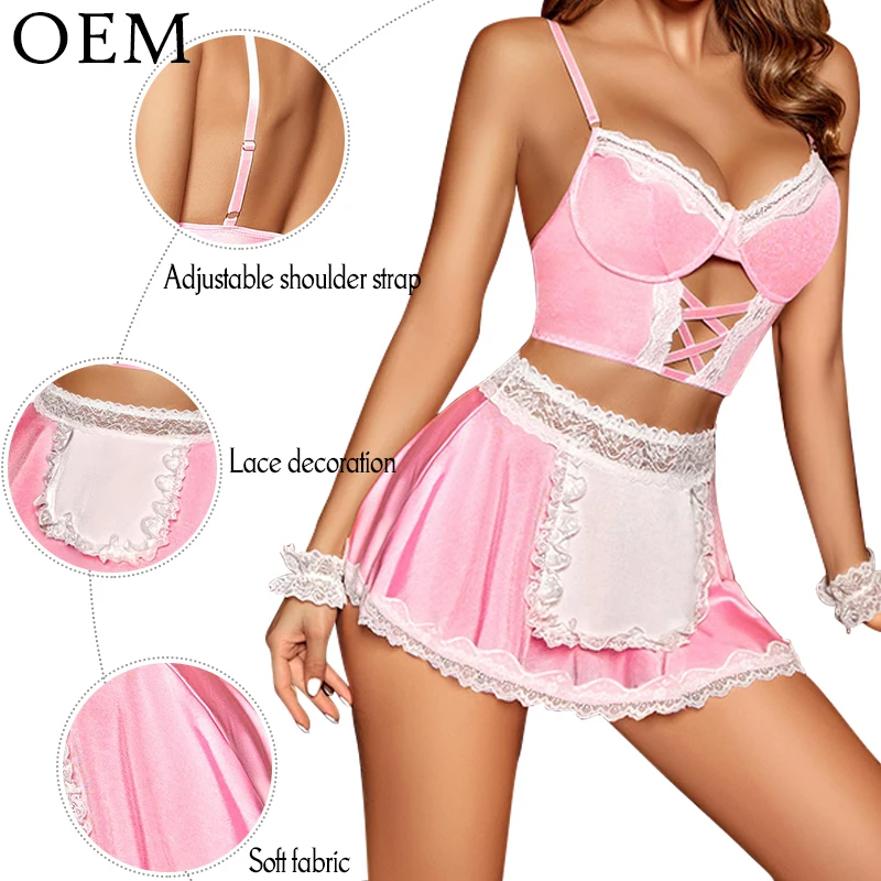 Factory Custom Retro 5 Pieces Set Sexy Apron Dress for Women Cosplay Lingerie Set Lace Rhinestone Maid Outfit Costume