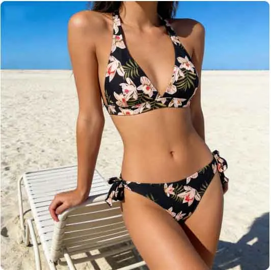 Sexy Two Piece Flower Designs Swimwear Beachwear for Women Quick Dry Tie Side Bikinis Set Triangle Swimsuit Swimwear for Summer