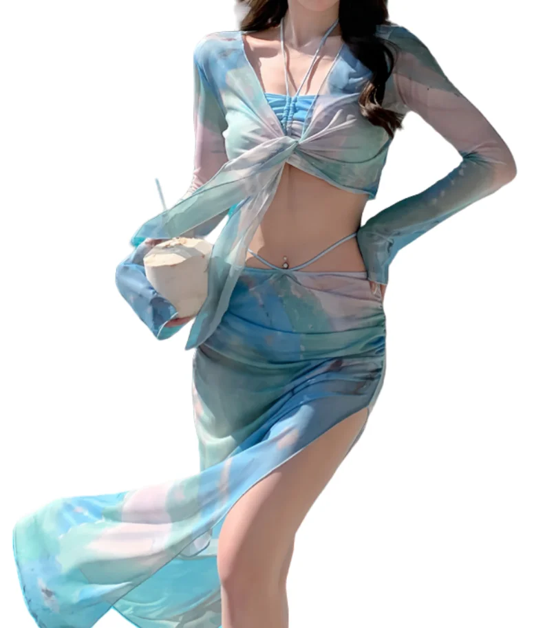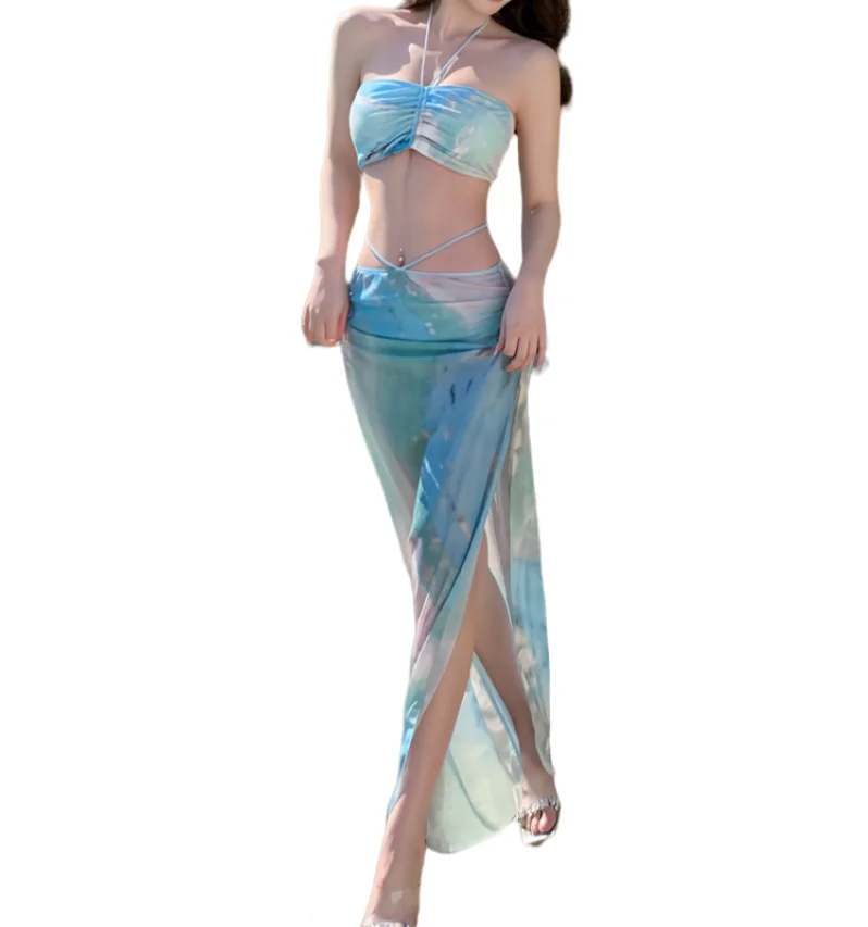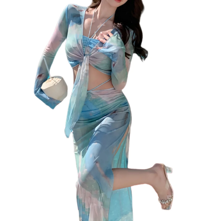 Women's Bandeau Swimsuit Sexy Bikini Set Four-Piece Bikini Pure Desire with Cover up UV Protection Long-Sleeve Dress for Summer
