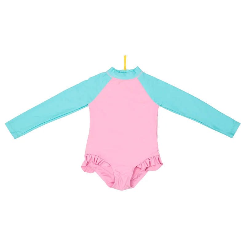 Custom UPF 50+ Sunscreen Eco-friendly Fabric One Piece Long Sleeve Swimsuit Bathing Suit Baby Girl Ruffle Floral Kids Swimwear