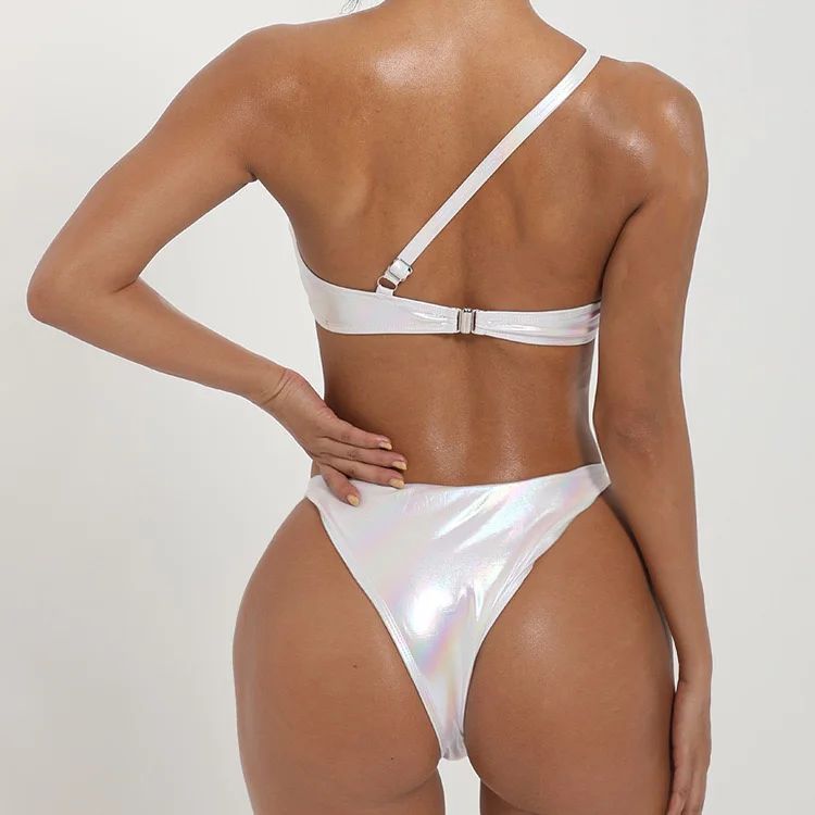 Extreme Sexy White Printed Bikini for Ladies High Quality Reflective Shiny One-Shoulder Swimsuit for Beach Wear Teens