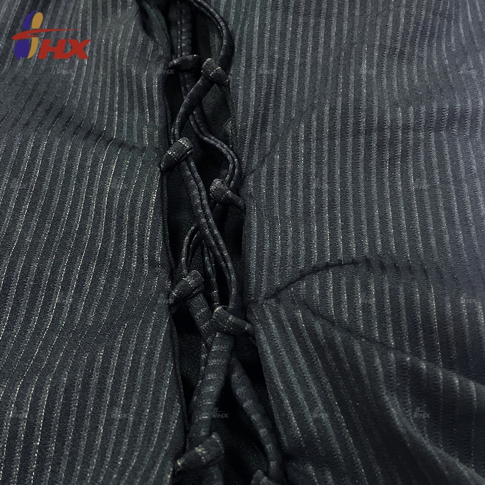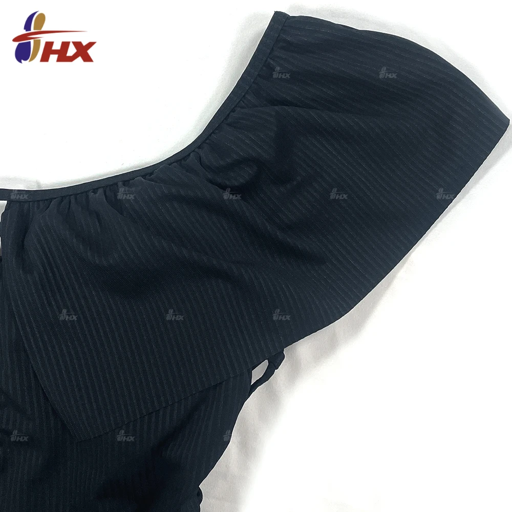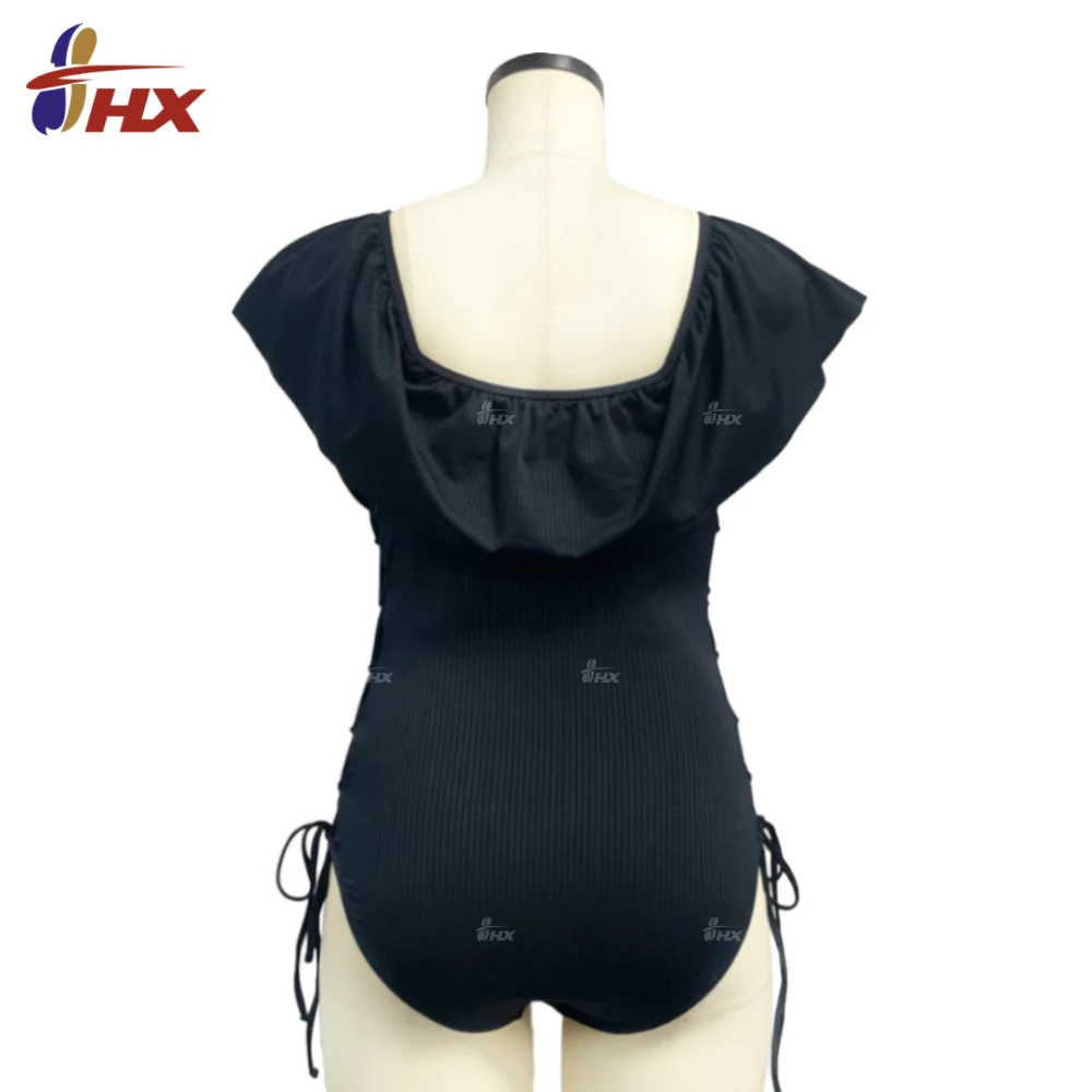 New Design One-Piece Black Bikini Sexy Bandage Monokini with Ribbed Fabric Ruffle Sleeves Print Pattern Drawstring Bathing Suit