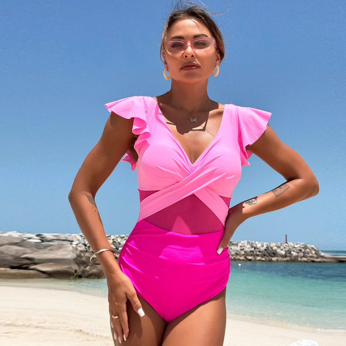 Plus Size Eco-friendly One Piece Swimsuit for Women Spandex/Polyester Mesh Patchwork Ruffled Sleeves Tummy Control Beachwear
