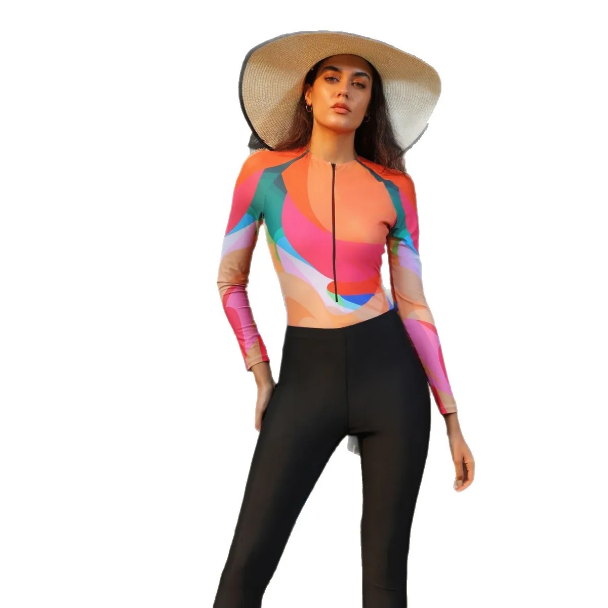 Muslim Modest Three Piece Swimwear with Middle East Floral Print Long Sleeve Top Full Length Pants Sun Protective Beach Outfit