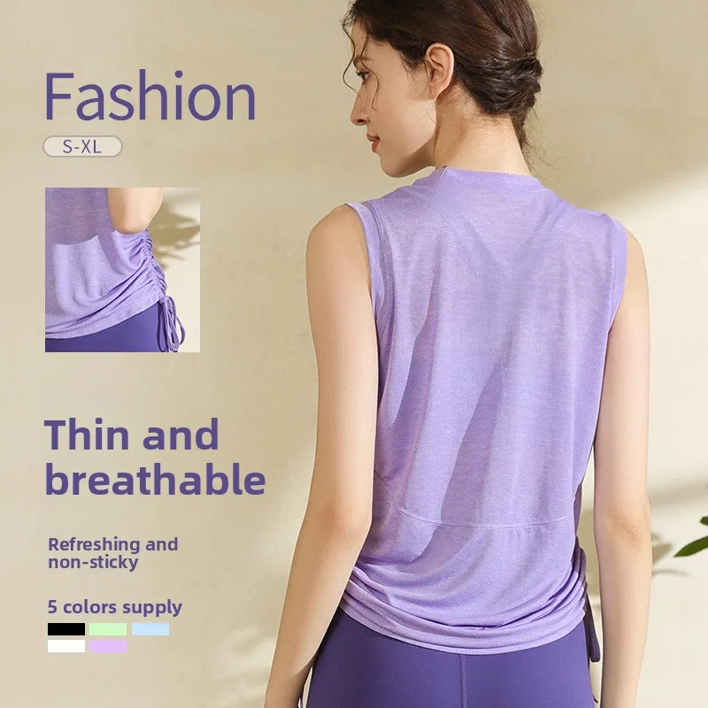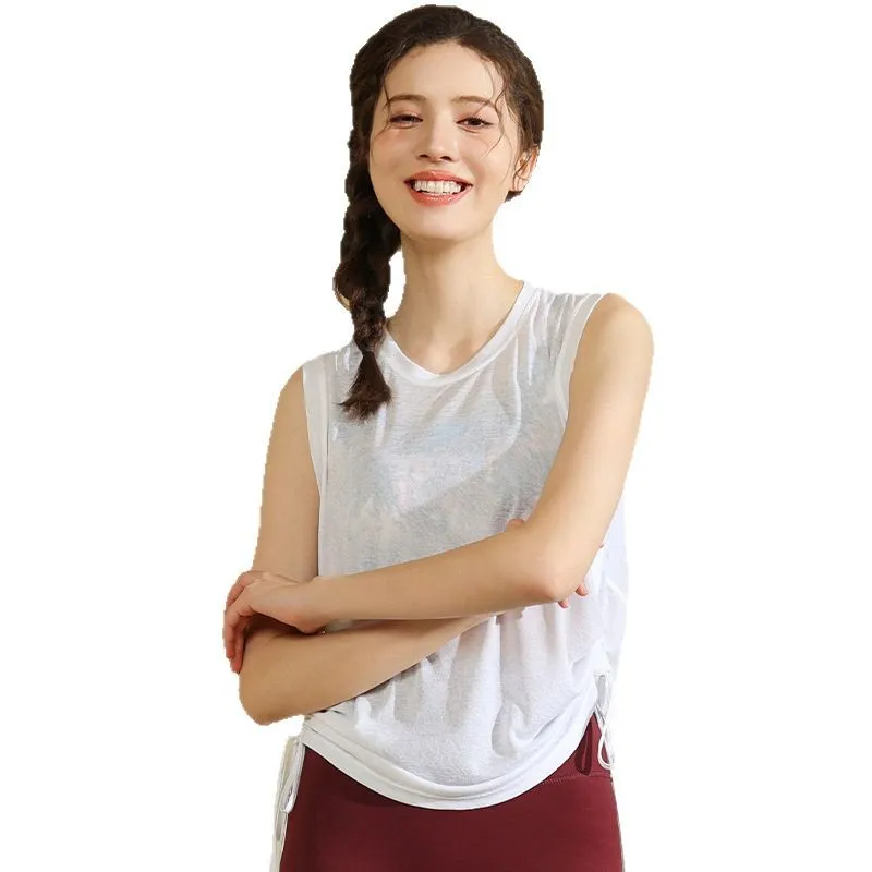 Women Plus Size Sleeveless Yoga Top Loose Fit Workout Shirt Drawstring Hem Breathable 100% Polyester Fabric Loose Neck Yoga Vest