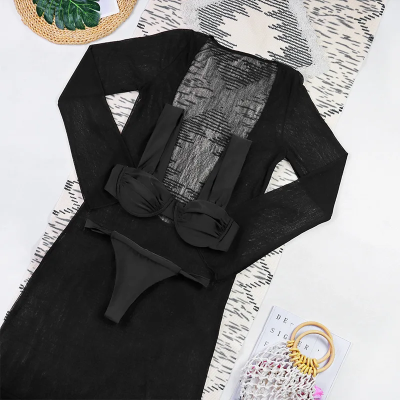 Three Piece Bikini Set 2026 Sexy Women Swimwear with Long Skirt and Long Sleeve Cover up Front Logo Breathable