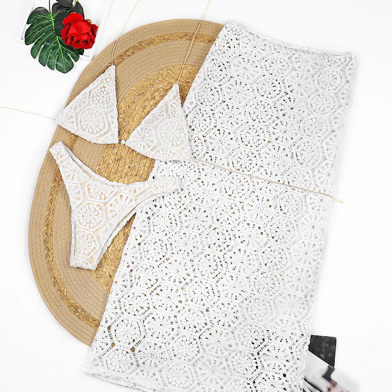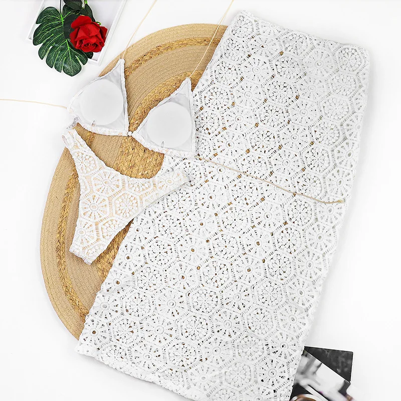 Three Piece Lace Bikini Set Sexy Women's Swimsuit with Maxi Skirt Cover-Up Backless Neckline Breathable