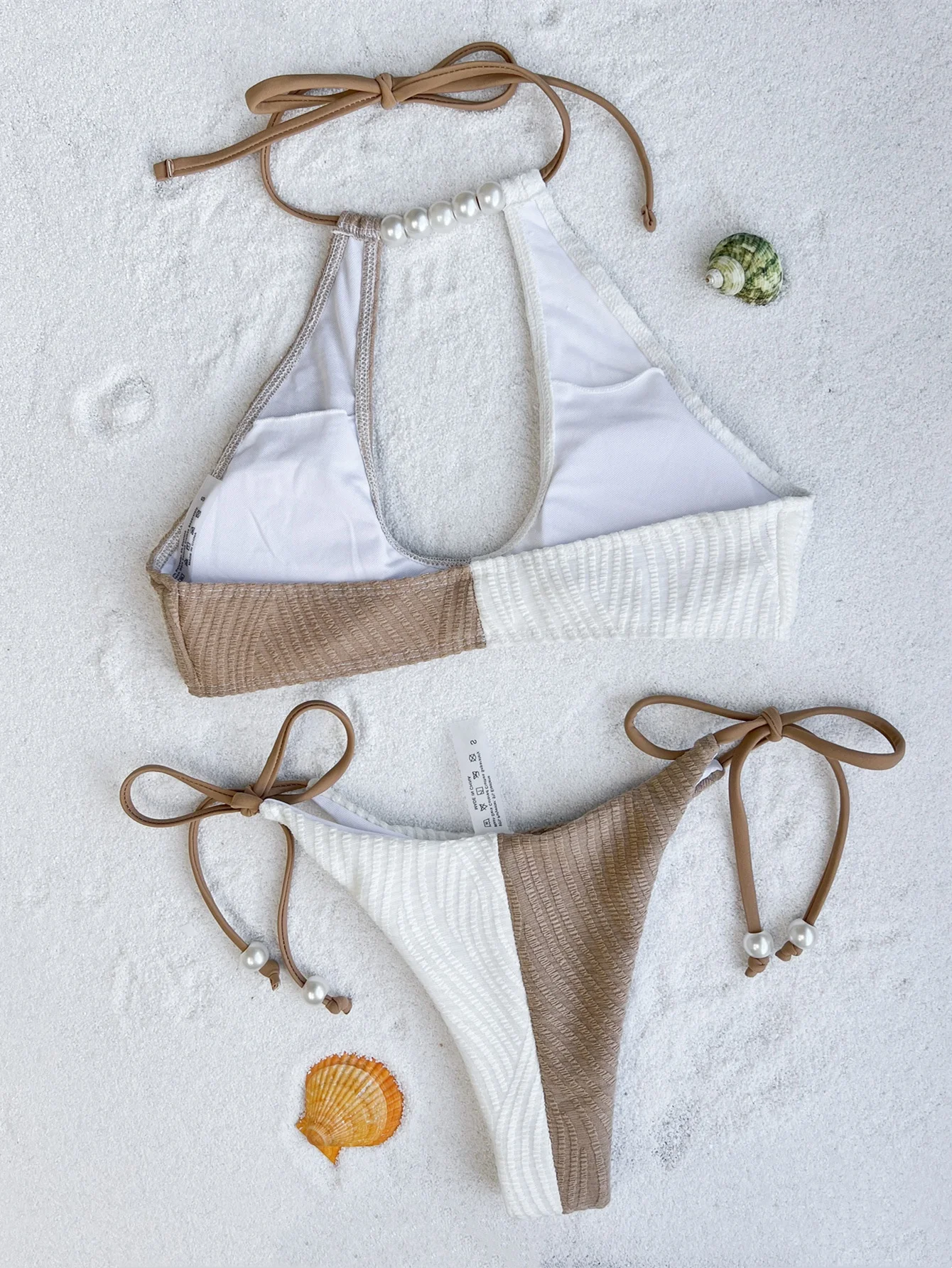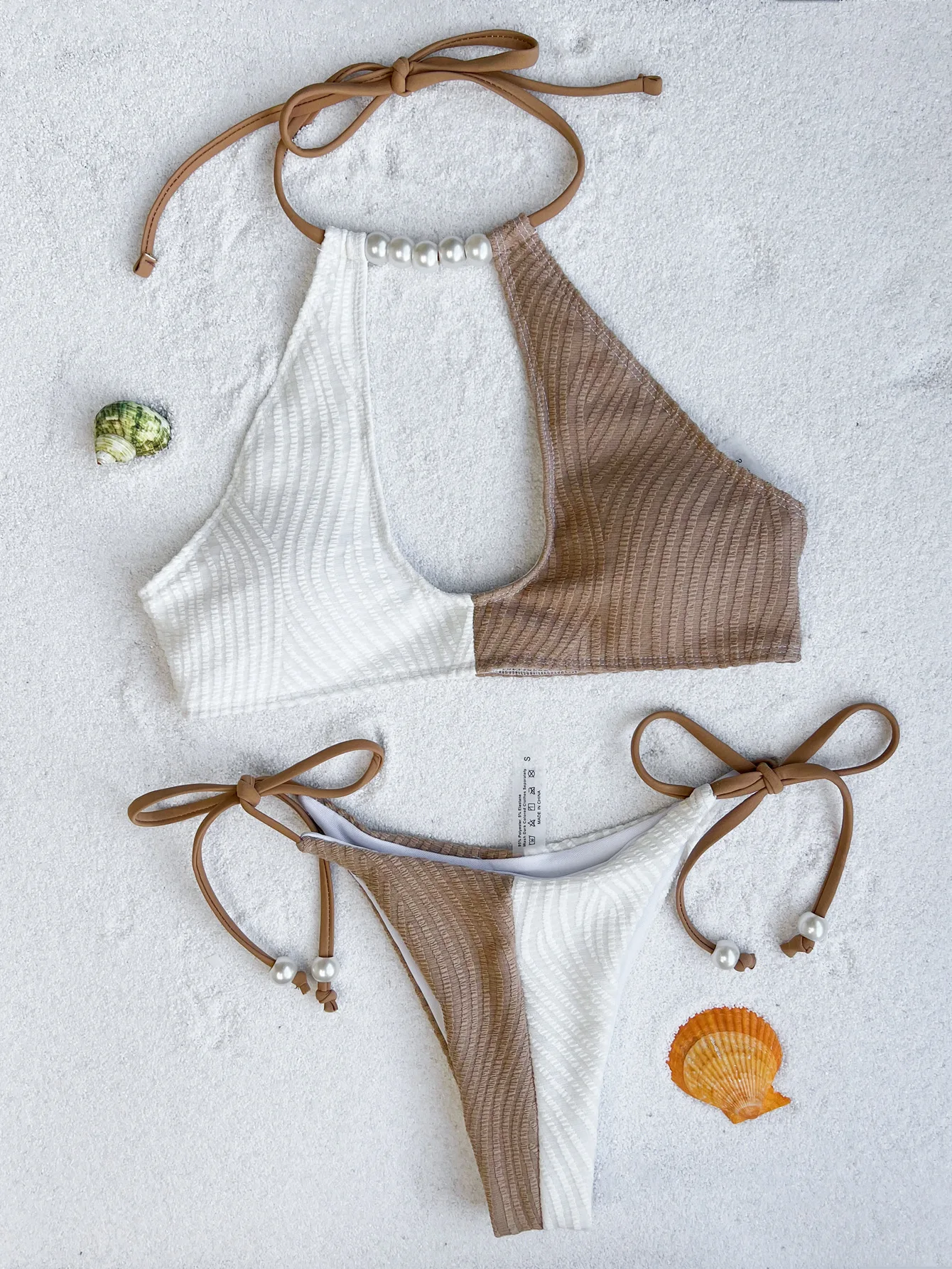 Pearl Decor Bikini Set, Sexy Cut Out Tie Strap Patchwork Swimwear for Women