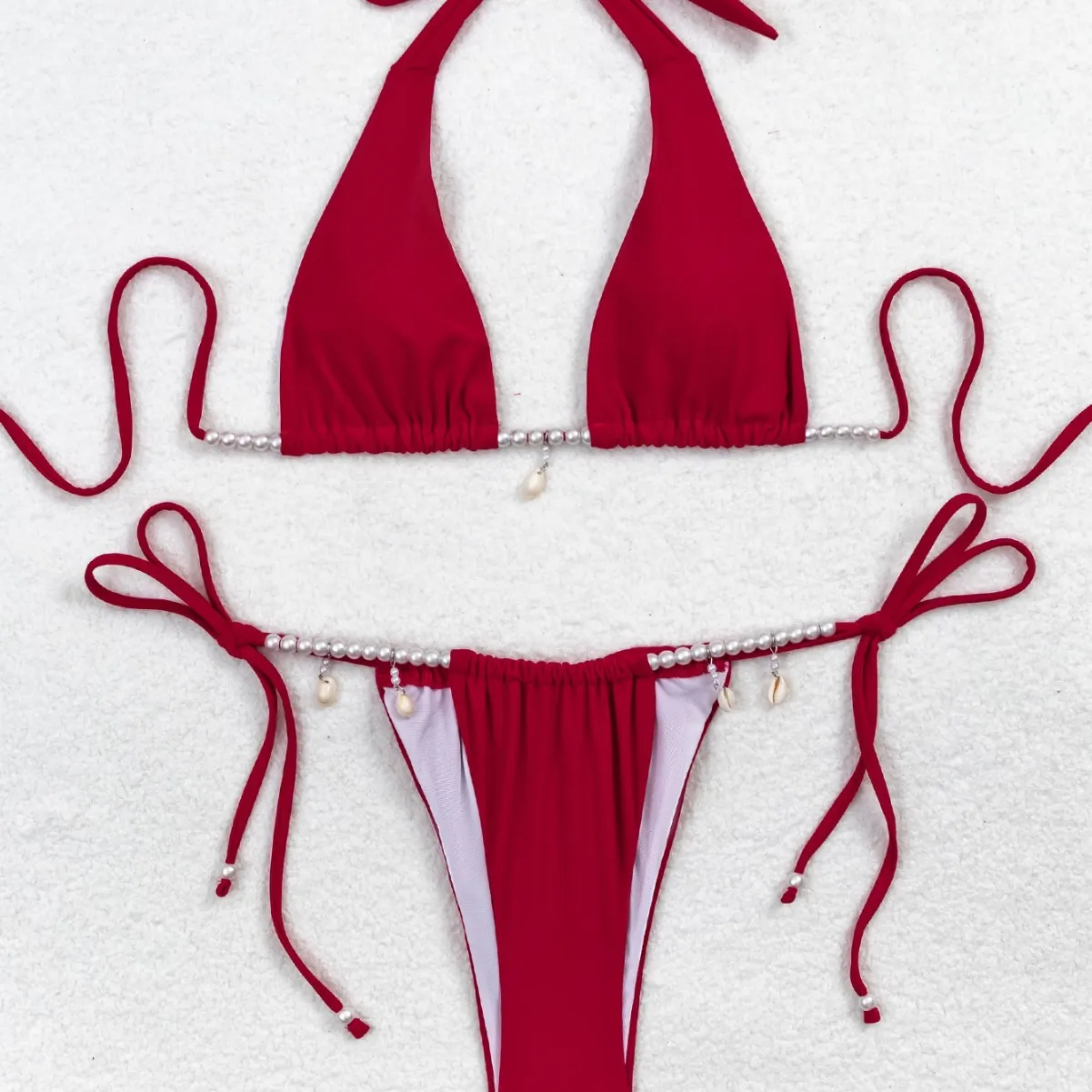 Sexy Halter Two Piece Red Bikini Set for Women with Pearl Decoration Spandex/Polyester Beachwear Summer Swimwear