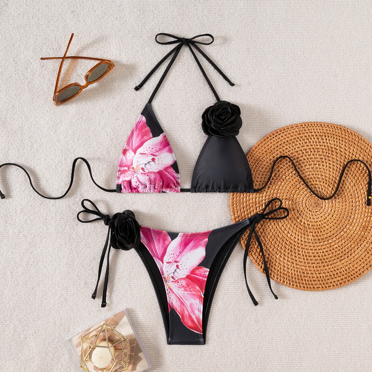 Basic S-L Women's Floral Print 3D Flower Brazilian Bikini Set 2-Piece Swimwear with Ties Detail