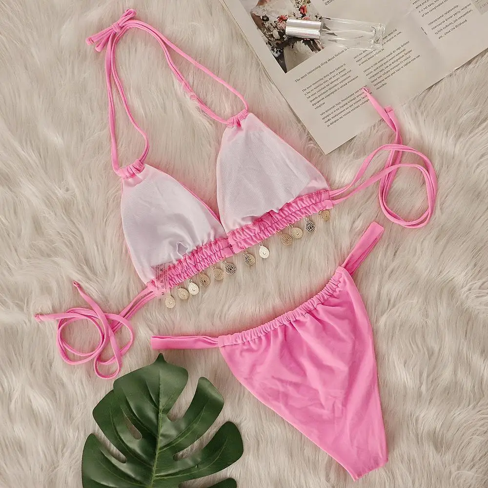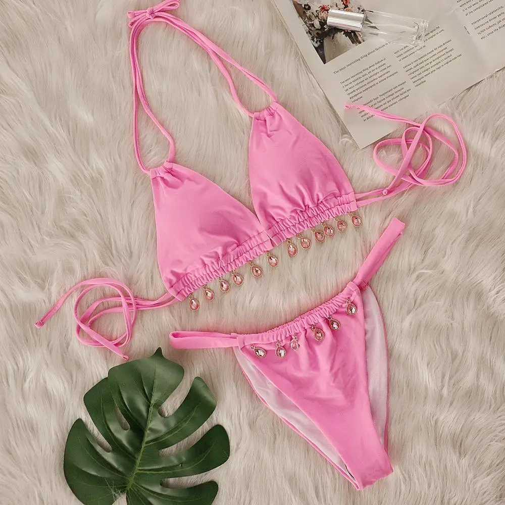 Women's Pink Bikini Set Sexy Backless Brazilian Cut Bottom Gem Pendant Tie Strap Design Two-Piece Swimsuit Rhinestone Decoration