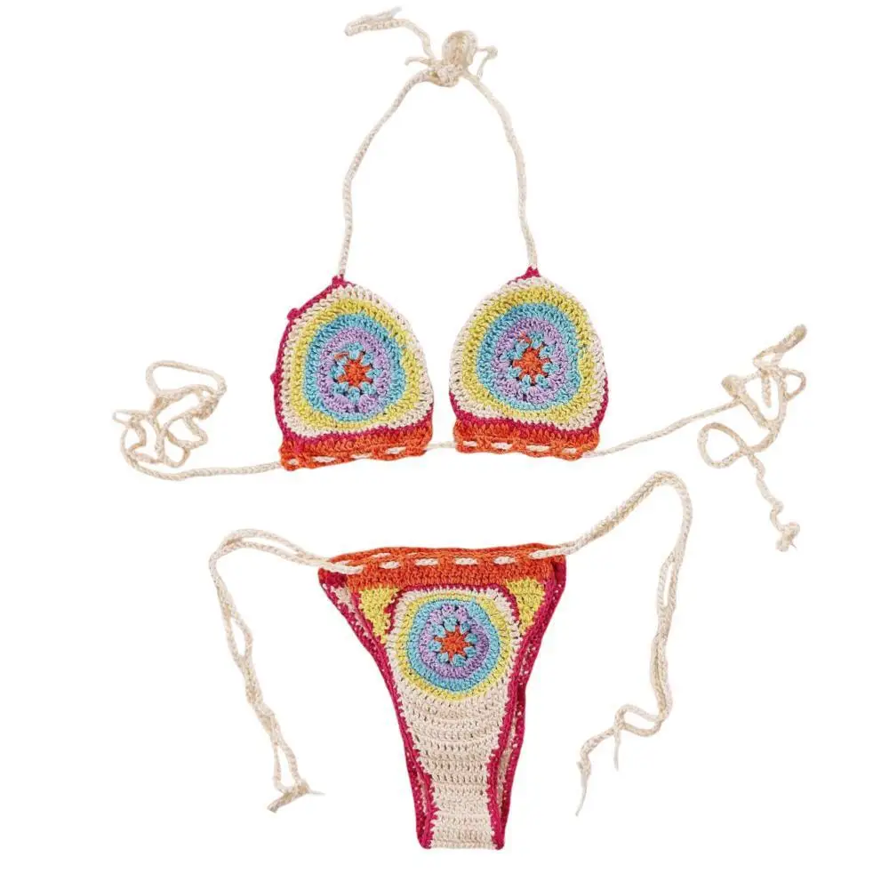 Handmade Crochet Bikini Set for Women Sexy Micro Two-Piece Swimsuit Tie Back Halter Top String Thong Bottom Spandex/Polyester