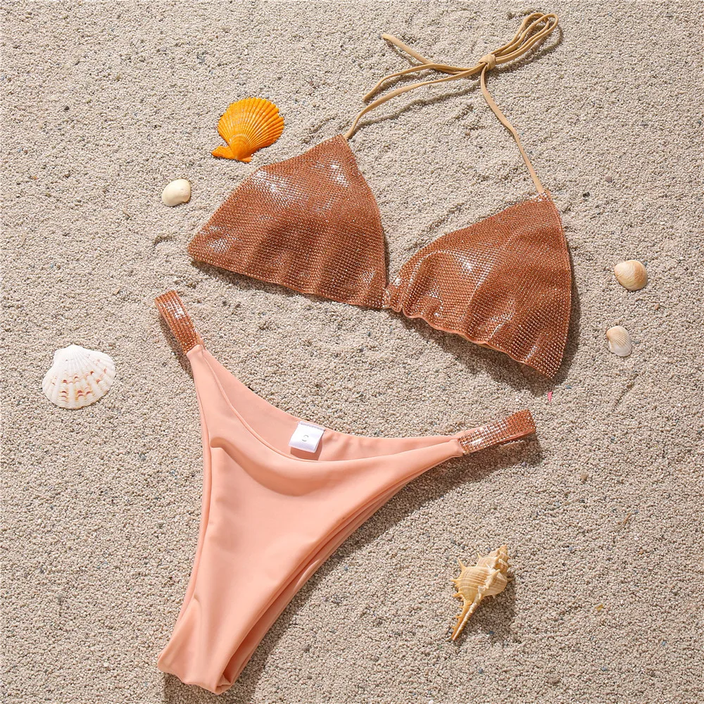New Designer Women's Diamond Bikinis Glitter Halter Brazilian Bottom 2-Piece Set with Printed Swim Brief Swimwear