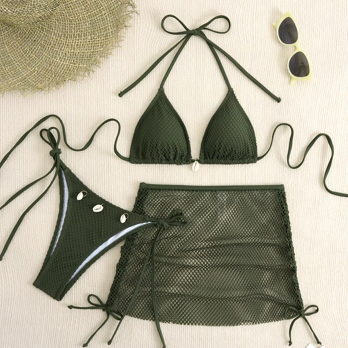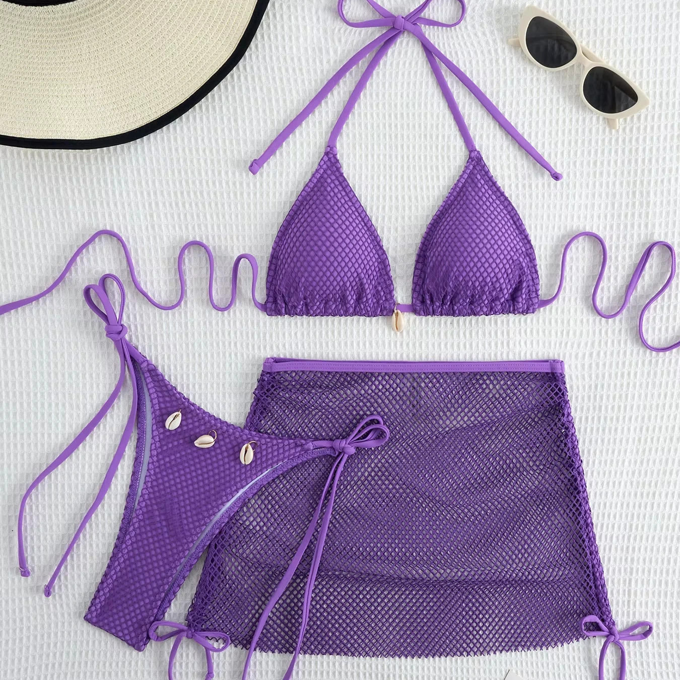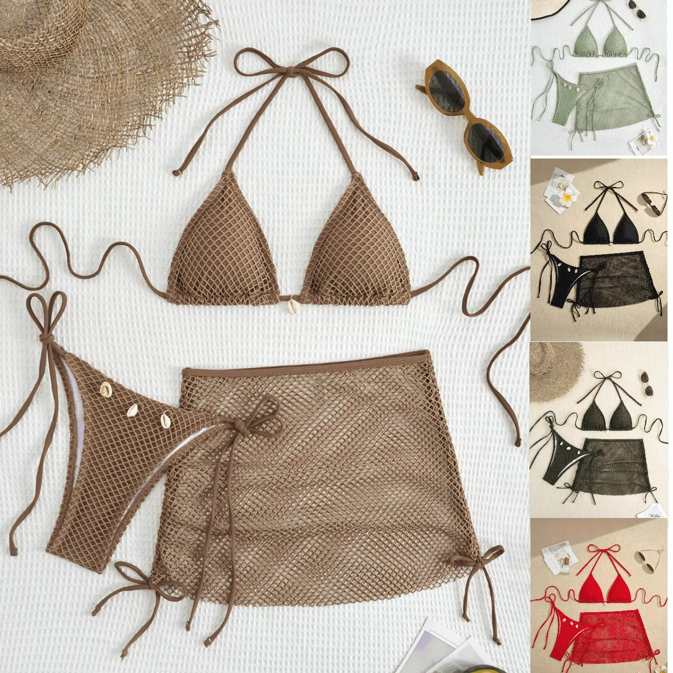 Women 3 Piece Bikini Set with Sheer Mesh Skirt Breathable Spandex/Polyester Summer Beach Swimwear
