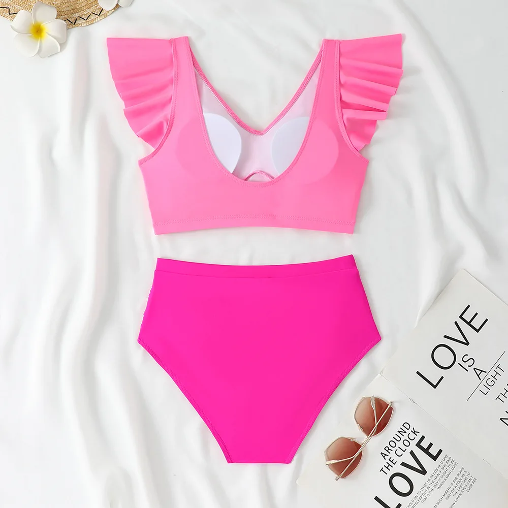 Women Two Piece High Waist Bikini Set with Ruffle Hem Top and Wrinkled Solid Fabric Swimsuit for Beach Swimwear