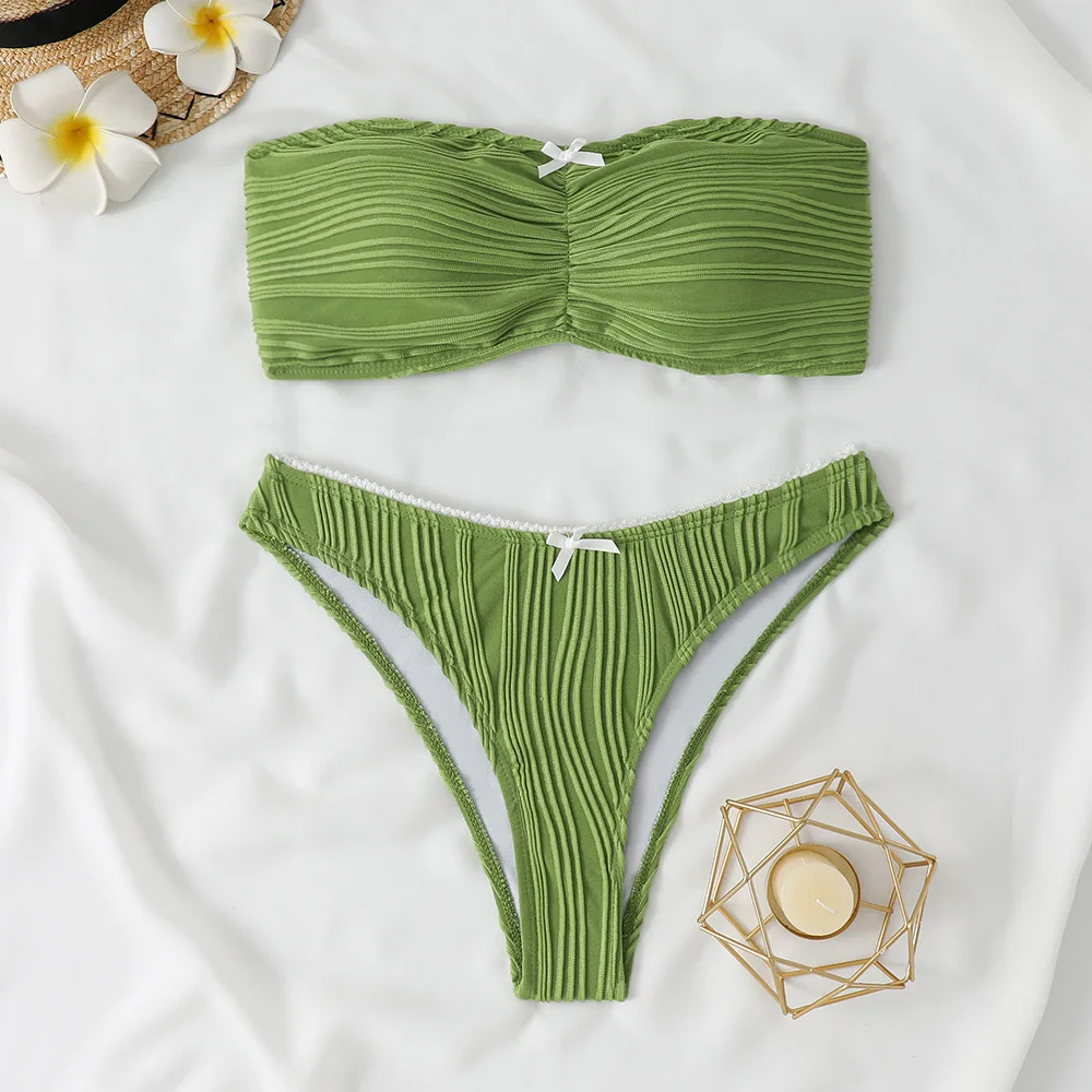 Women Sexy Two Piece Bikini Set Bandeau Strapless Top and Low Rise Bottom Solid Color Swimsuit for Summer