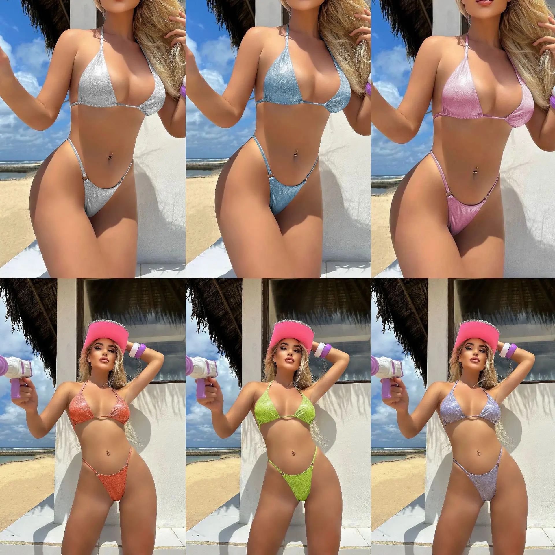 Sexy Sparkly Thong Bikini Set for Women Two Piece Swimwear with Backless Design and Glitter Accents