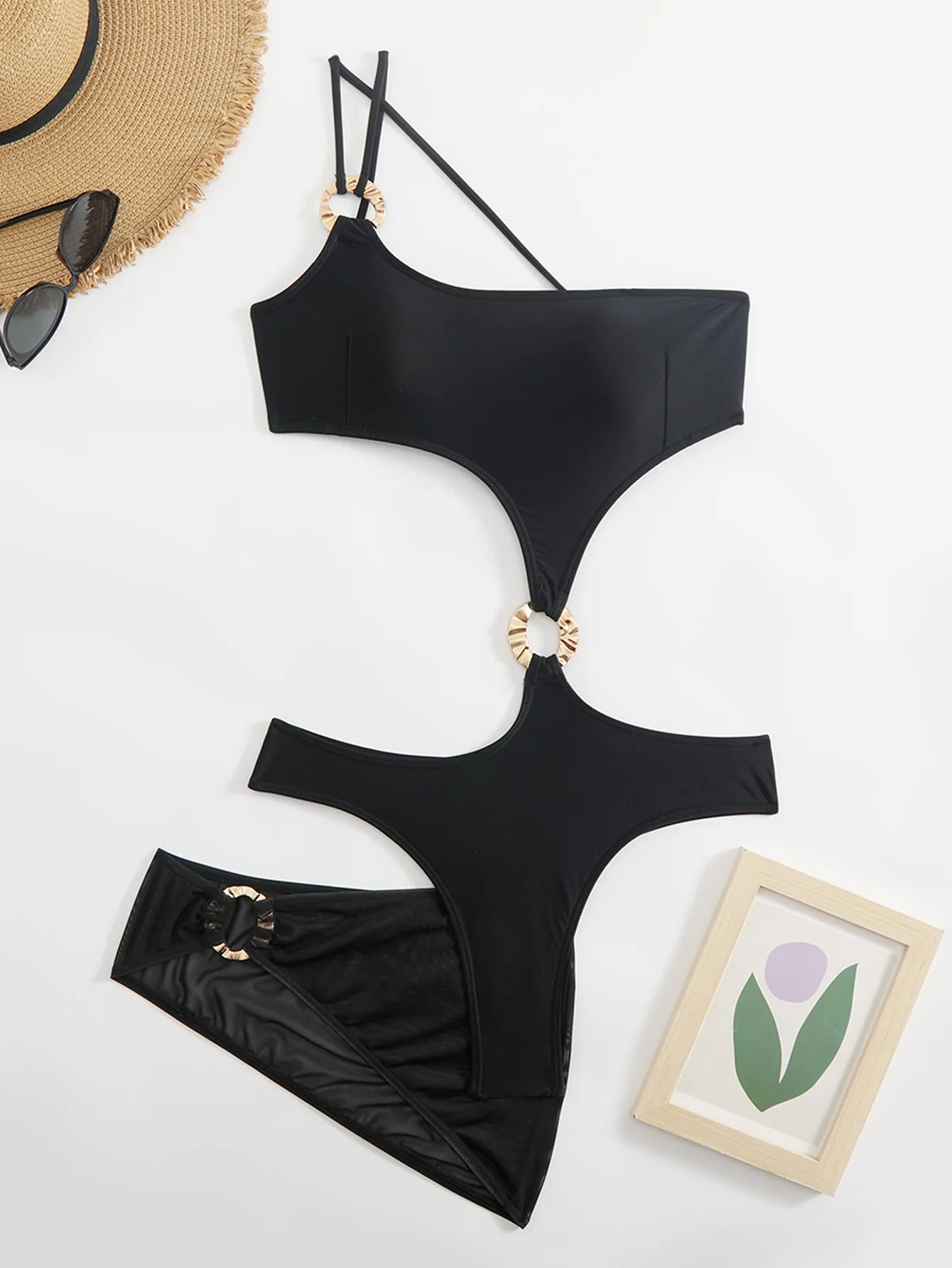 Three Piece Swimsuit Set for Women Sexy One Shoulder Monokini with Hollow Out Design Metal Ring and Black Skirt Cover up