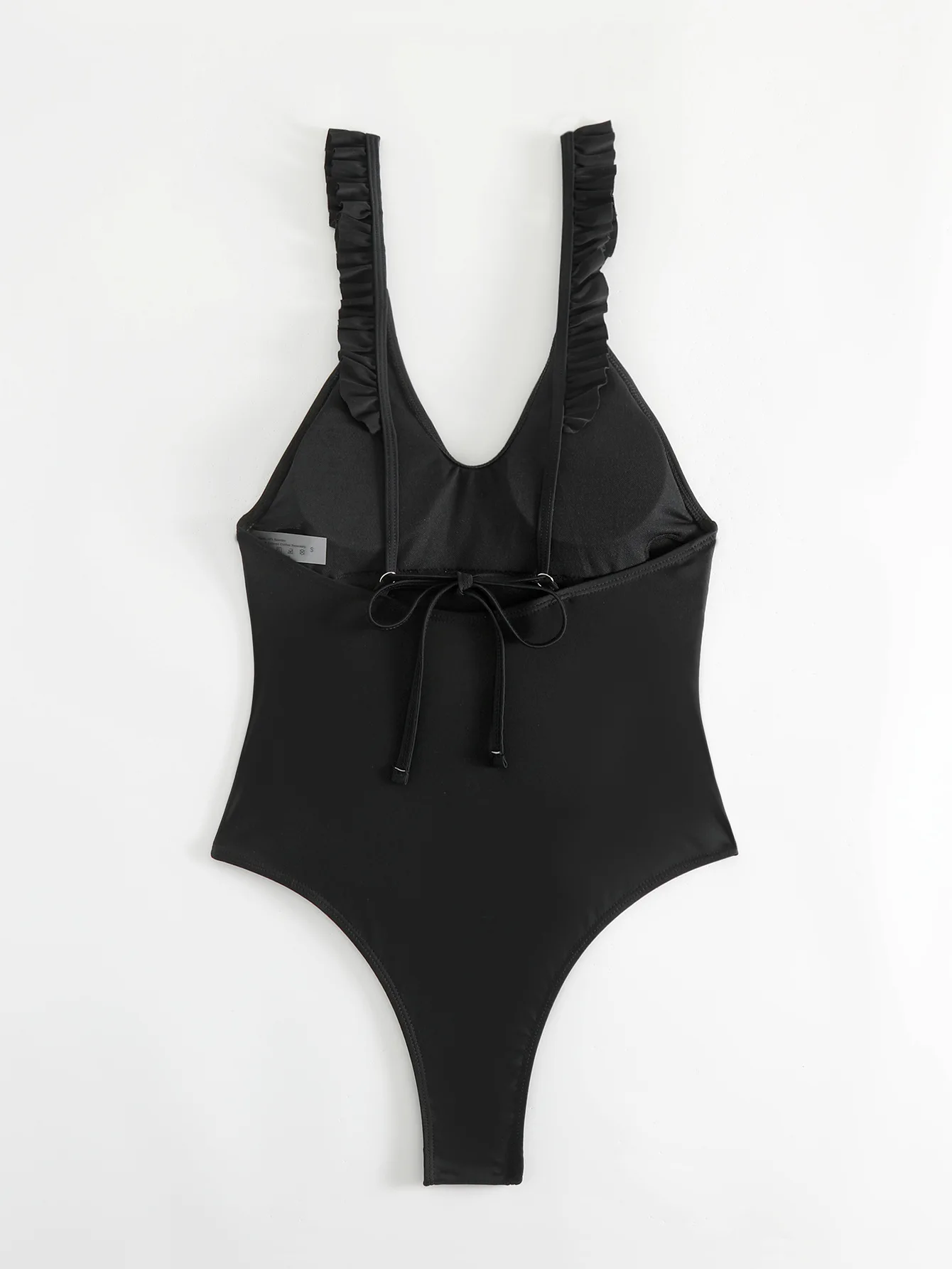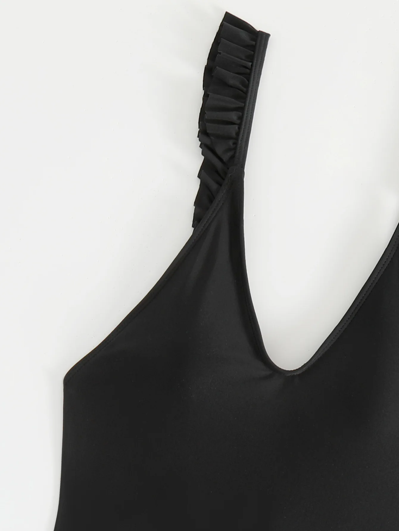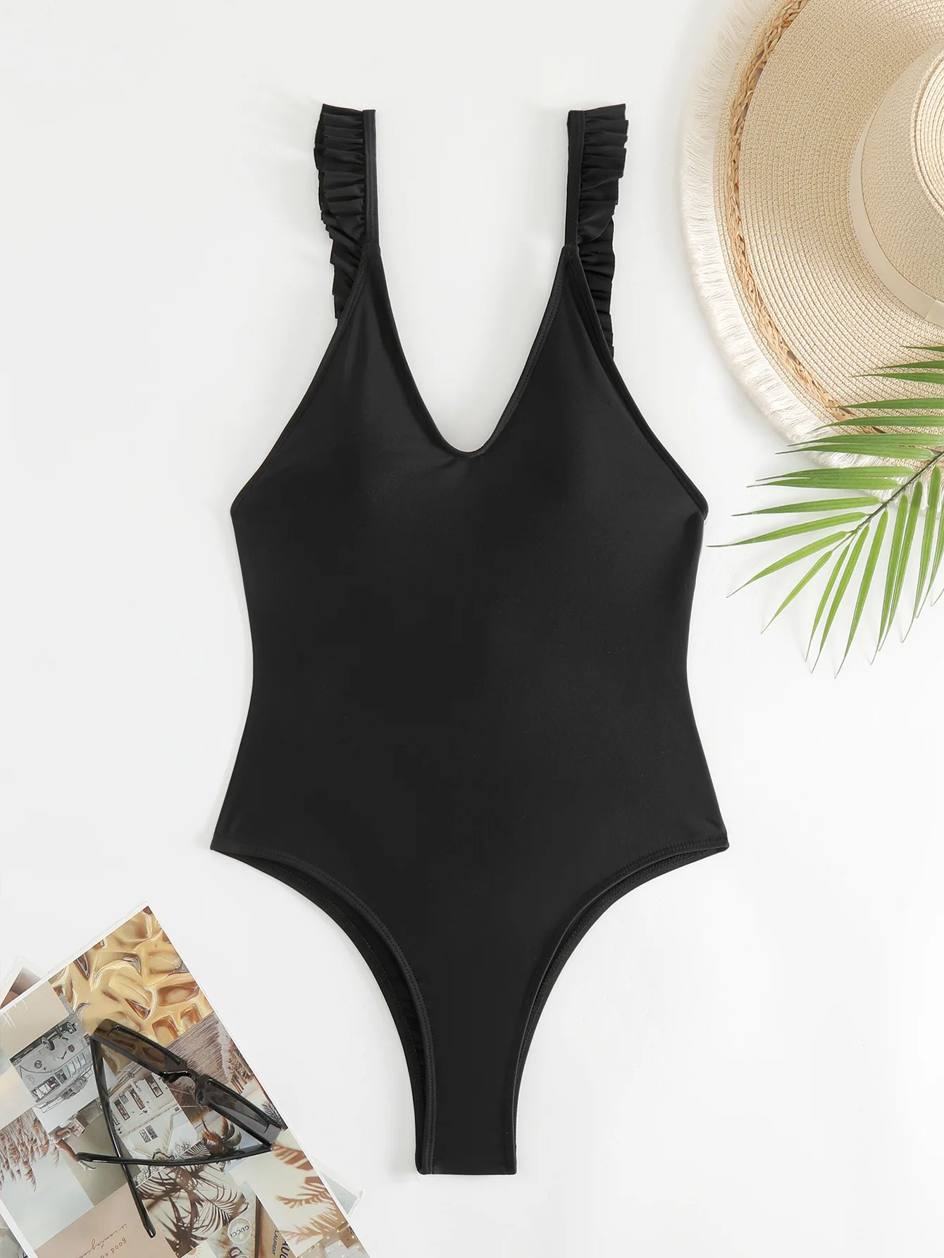 Sexy Black One Piece Swimsuit with Ruffle Sleeves Solid Color Women Beachwear Monokini