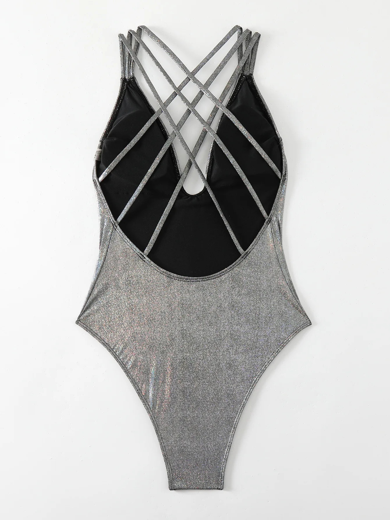 Sexy Glitter Shiny High Cut One Piece Swimsuit for Women Deep V Cross Back Solid Color 2 Piece Set
