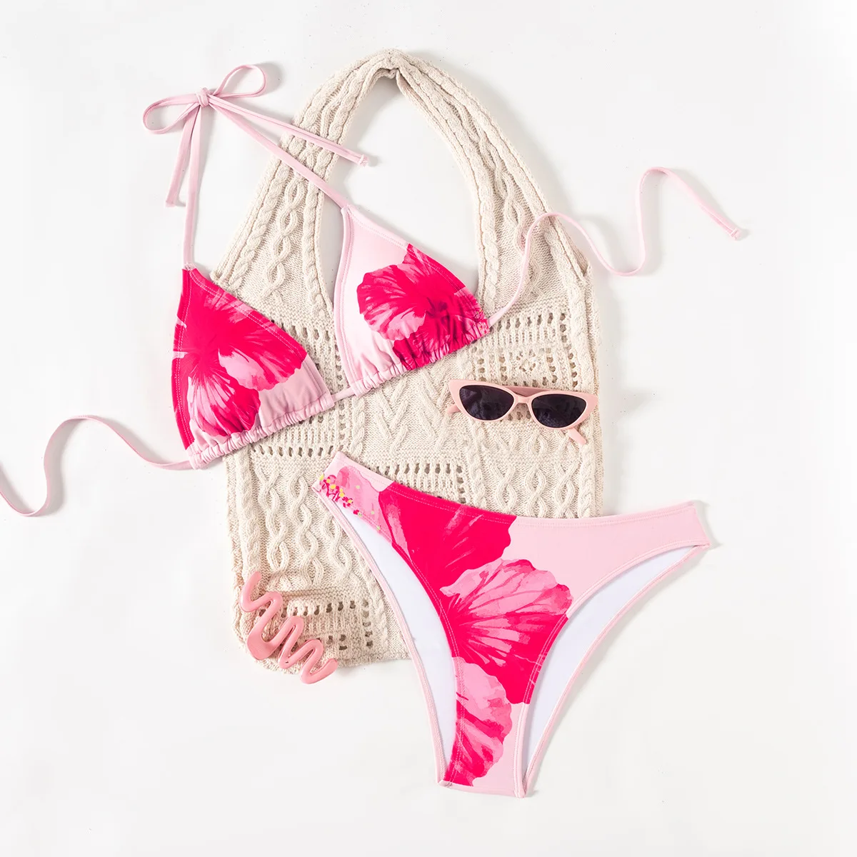 Floral Print Two-Piece Bikini Set for Women Sexy Halter Neck Top and Tie Side Bottom Swimsuit