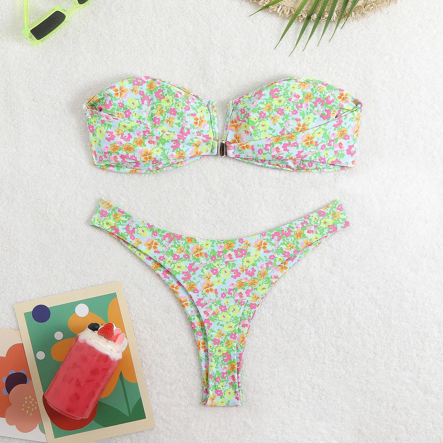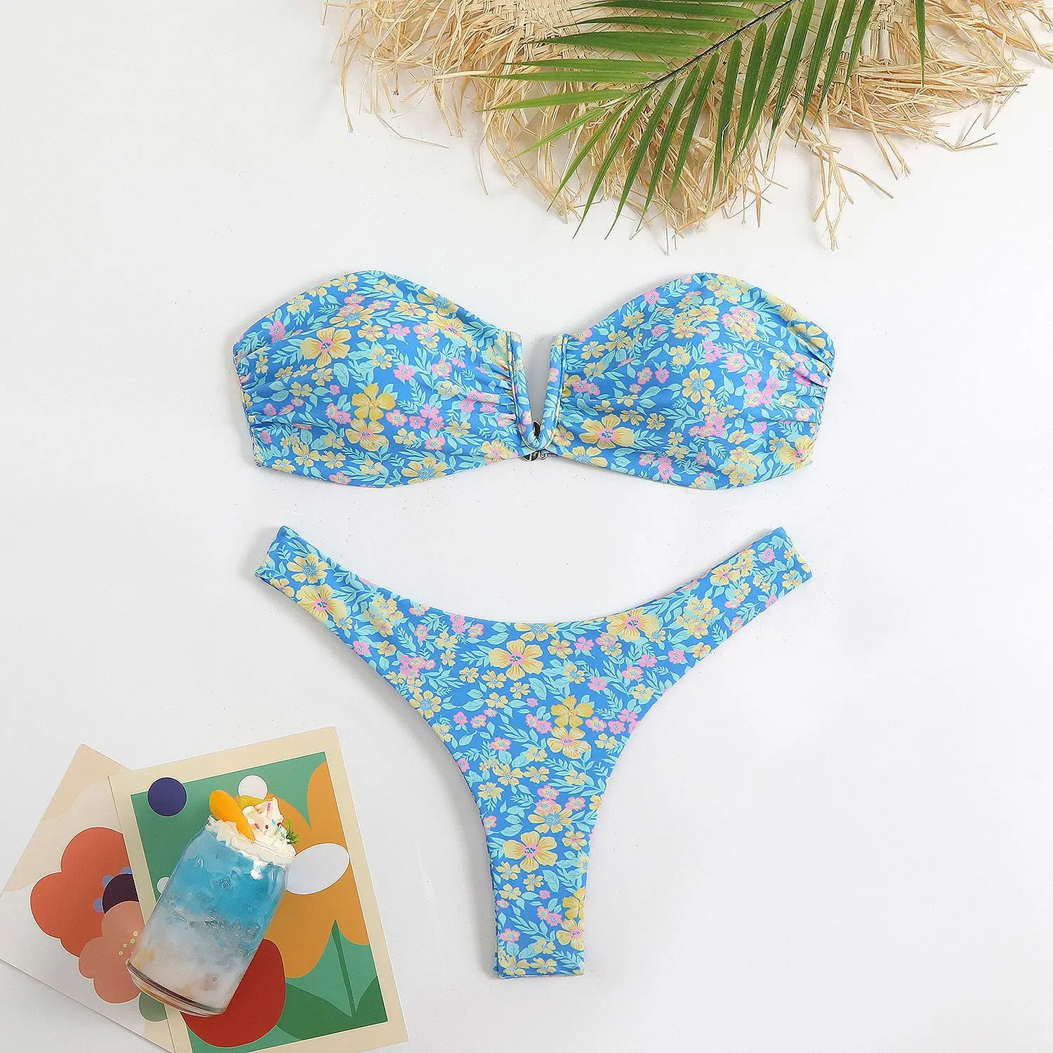 Sexy Floral Double Printed Breathable V Neck Bikini Set for Women with Underwire Bandeau Top and Thong Bottom