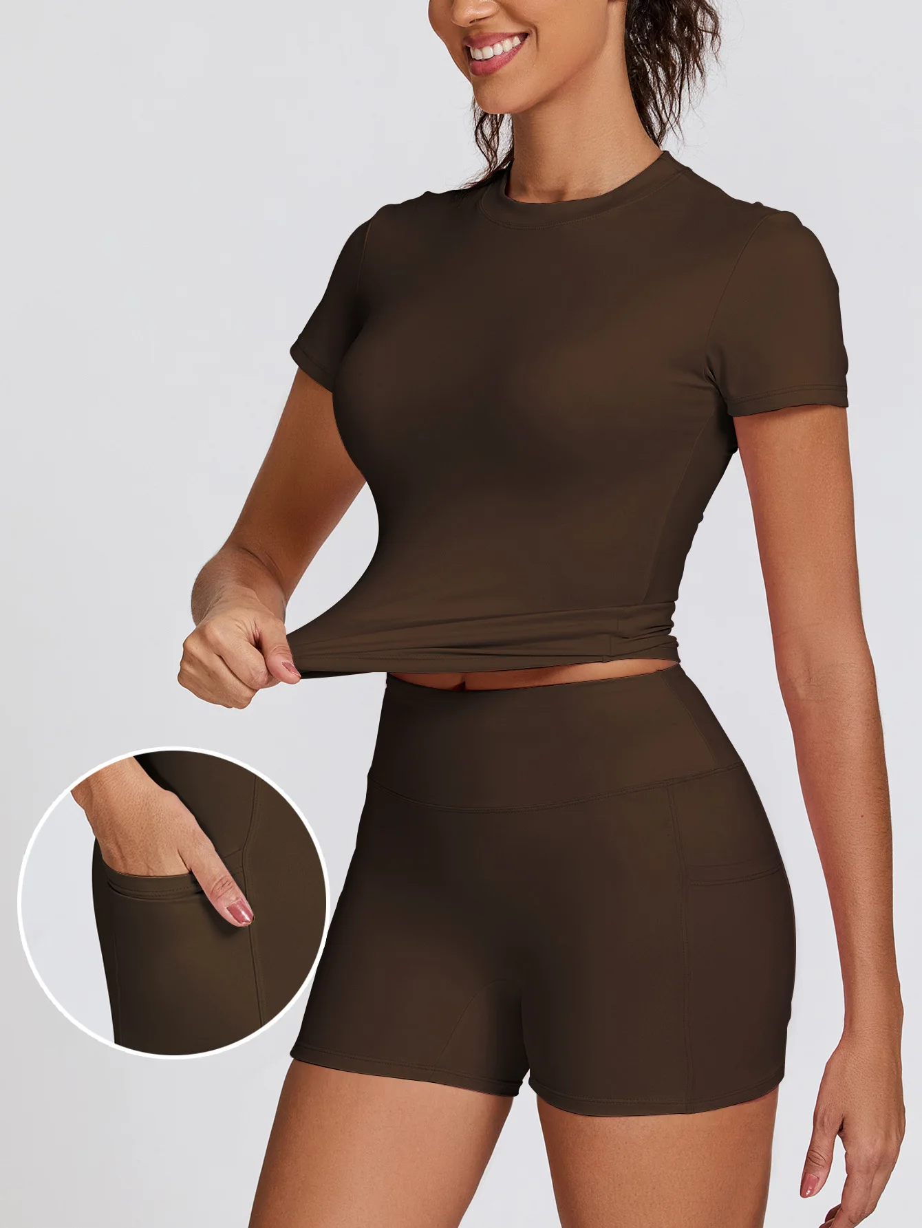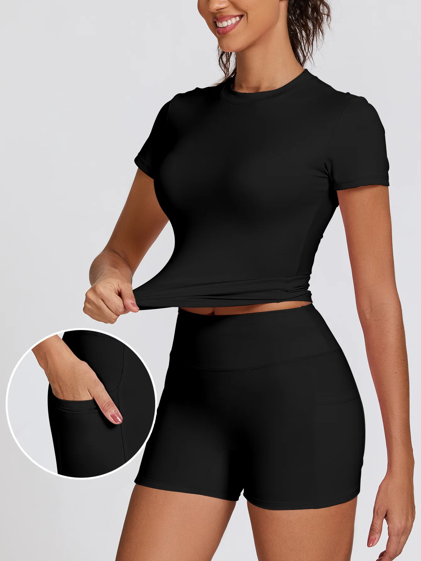 2 Piece Women Yoga Outfit Set, Tight Fit Workout Top and Peach Hip Shorts with Pockets for Gym and Fitness