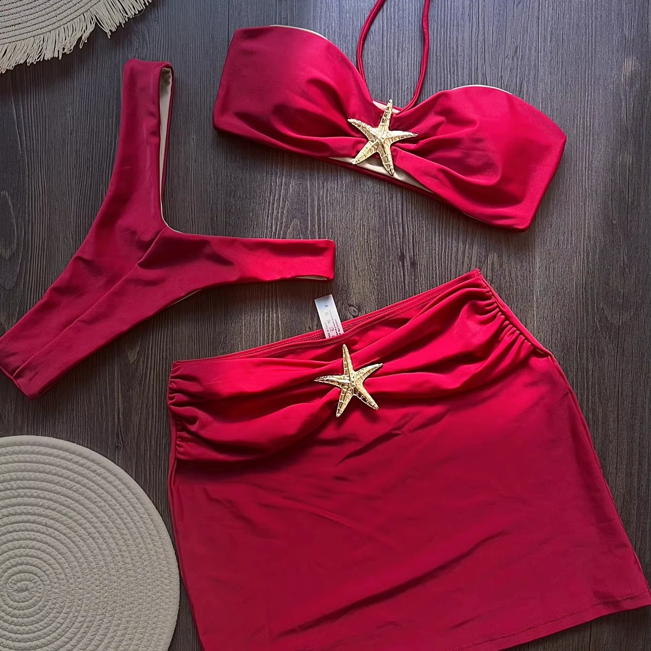 2026 Three Piece Halter Sexy Solid Color Spandex/Nylon Bikini Set with Skirt Women Swimwear Outfit
