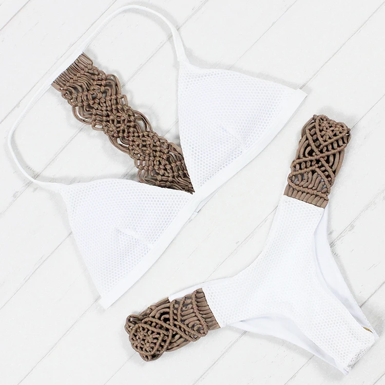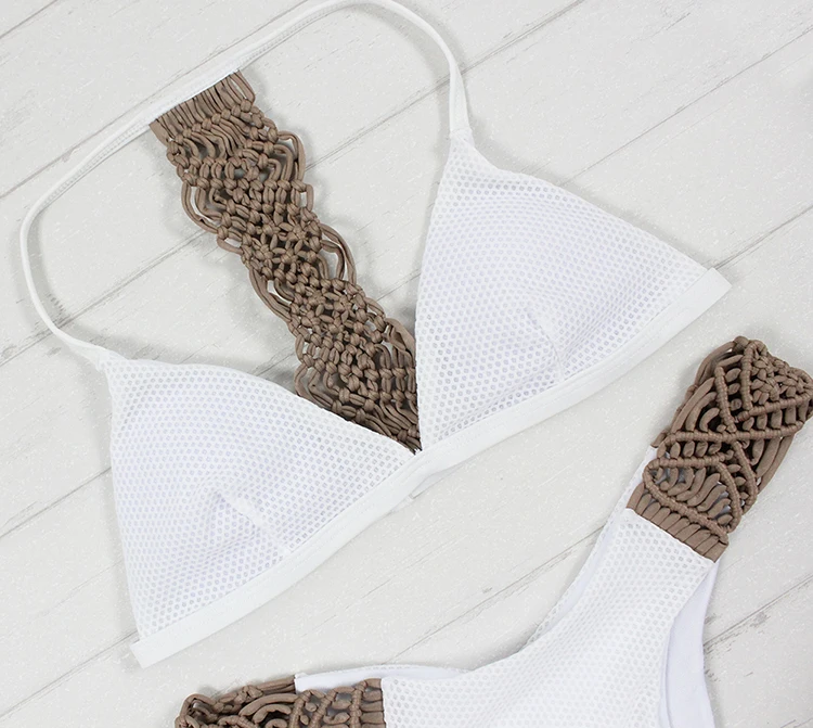 Ladies Vintage Solid 2 Piece Set Sexy Crochet Swimwear Handmade Knitting Breathable Push up Bathing Suit for Women