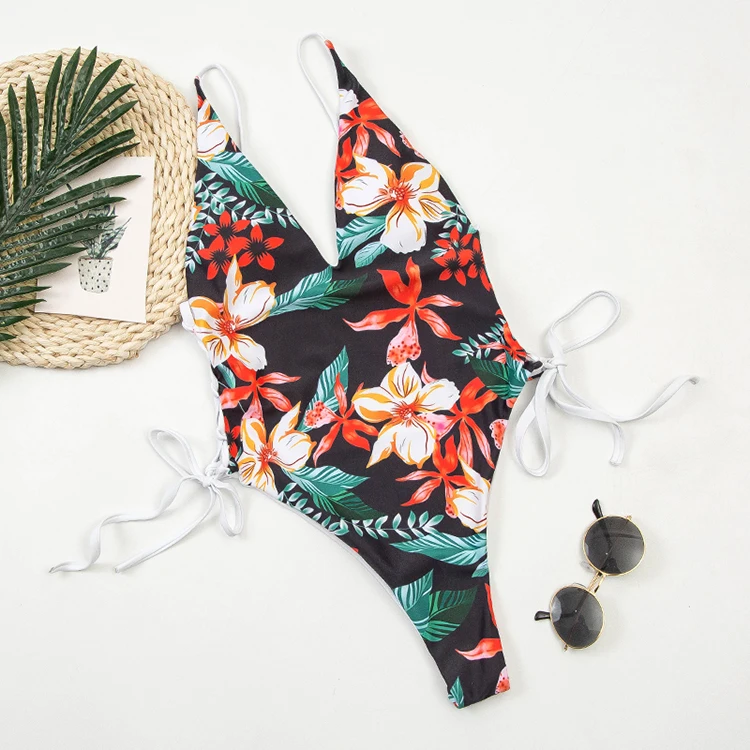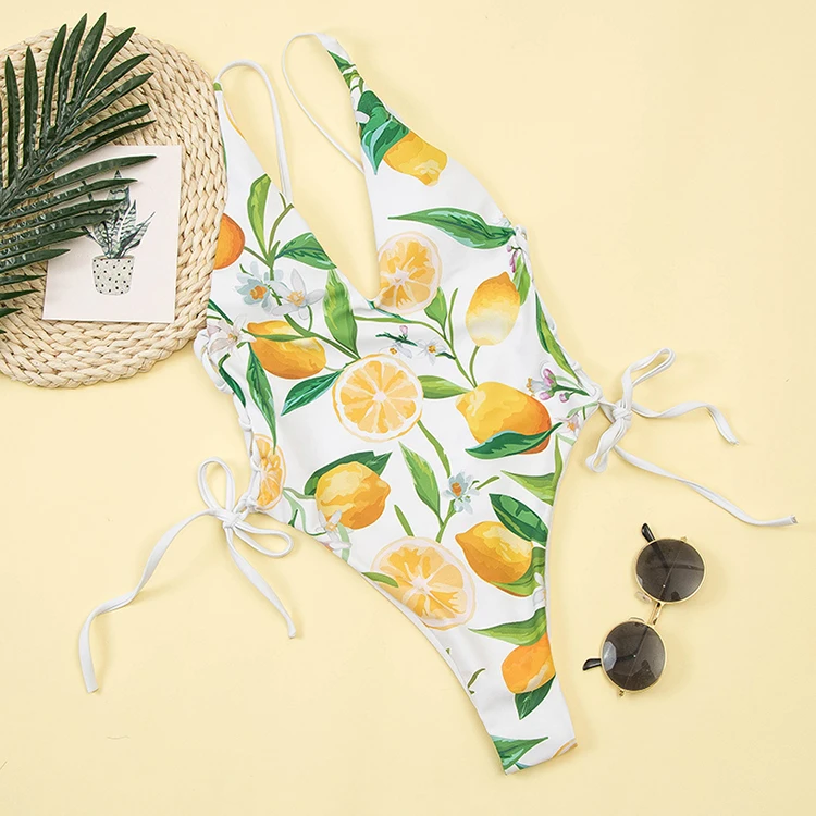 OEM Custom One Piece Swimsuit Sexy Cut Swimwear Women Beachwear Lemon Print Bandage Thongs Bodysuit