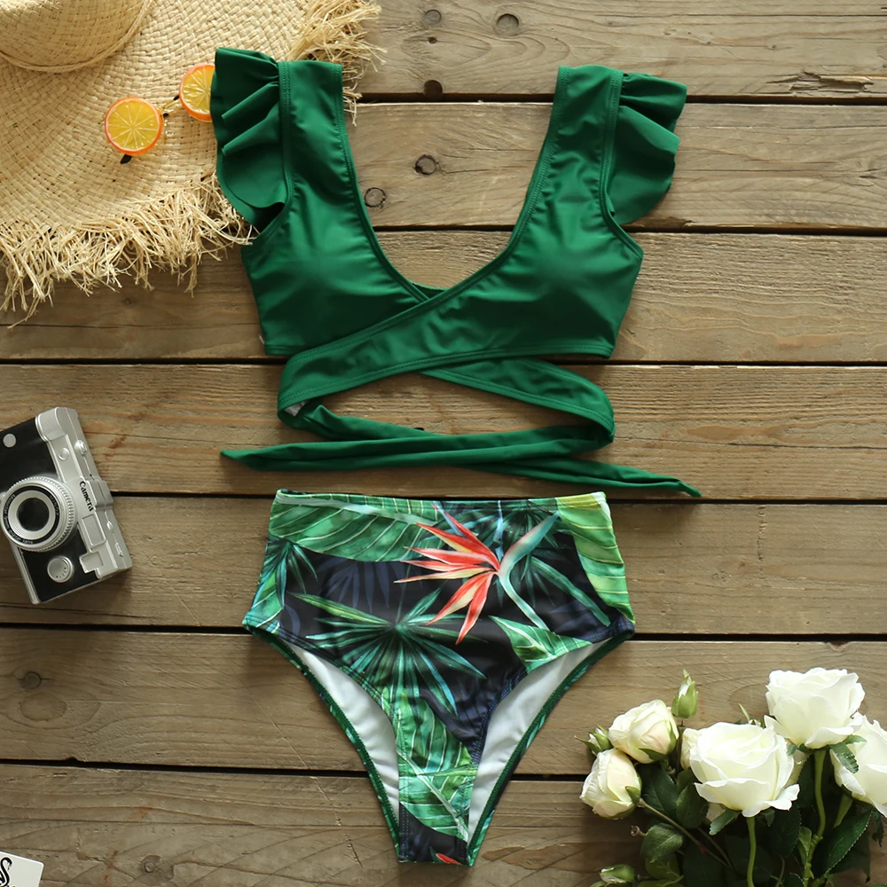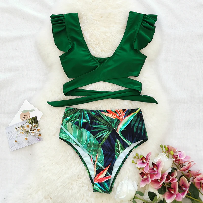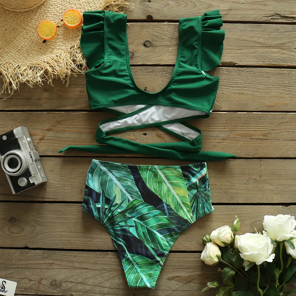 Sexy High Waist Swimsuit Women Cross Shoulder Ruffle Bikini Summer Two Pieces Print Swimwear Push up Bathing Suit