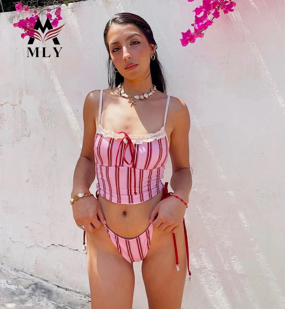 OEM ODM Stripe Ruffle Trim Tie Side Thong Bikini Swimsuit Women's 2026 Adjustable Custom Swimwear