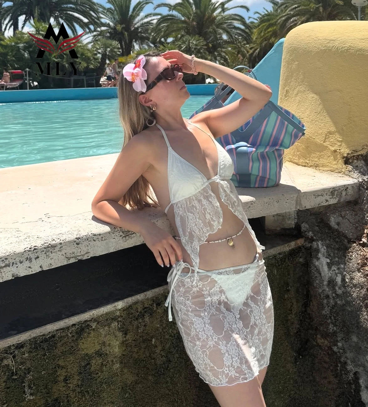 Women Sexy Lace Luxury Bikini Set 3 Piece Halter Triangle Swimsuit & Sheer Beach Skirt for Beach & Resort