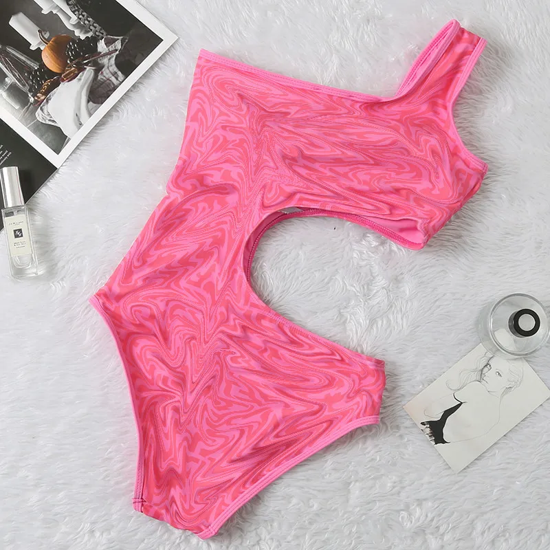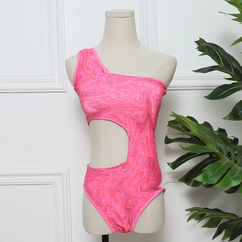 2026 Ladies Sexy Slim One-Piece Bikini Pink Solid Single Shoulder Swimsuit