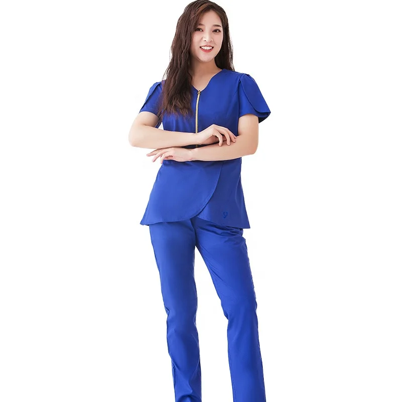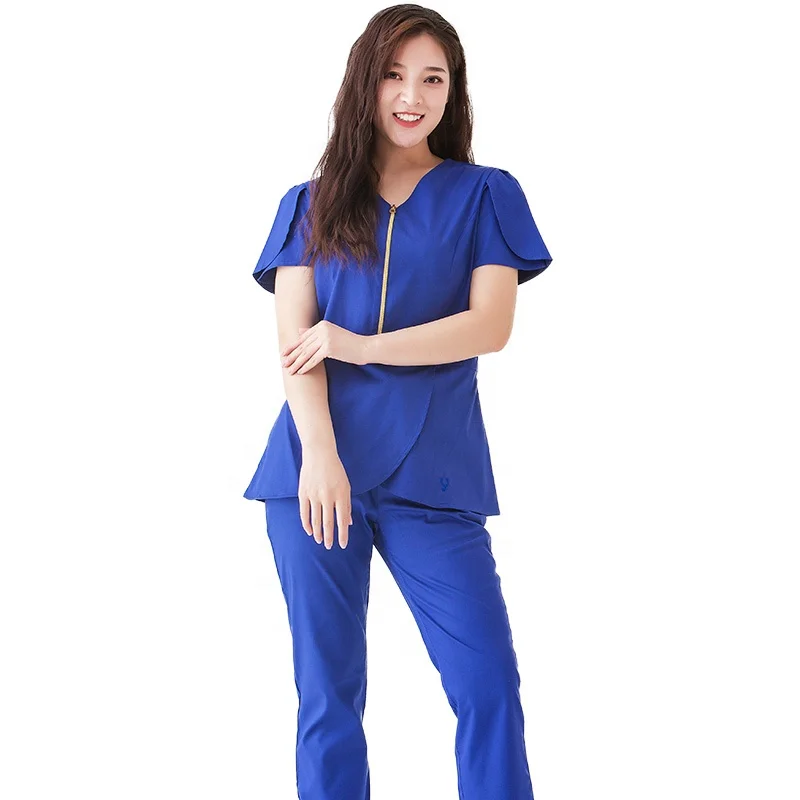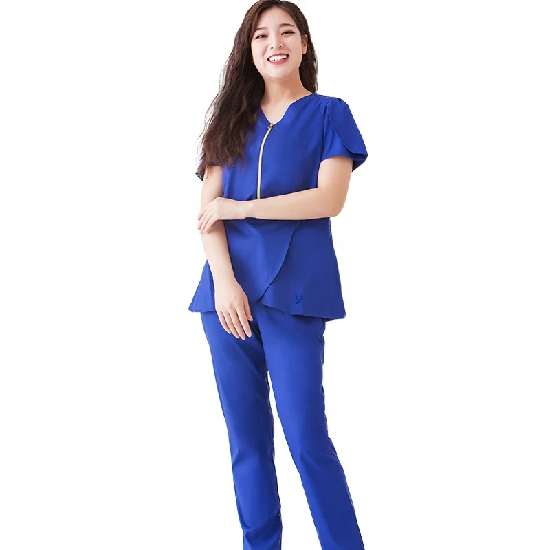 Factory Wholesale Custom Women's Fashionable Fitted Nurse Uniform Woven Fabric Stretchy Zipper Scrub Suit for Hospital Use