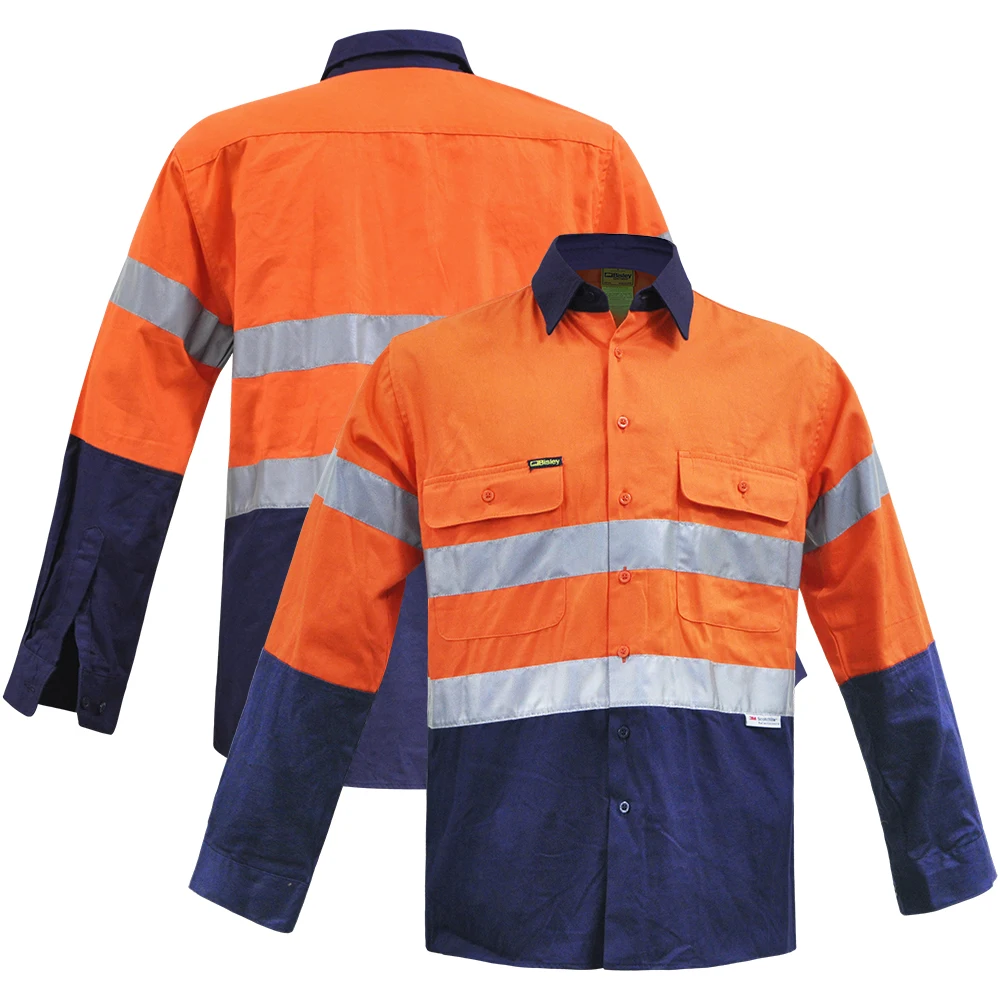 100% Cotton 150gsm Twill Hi Vis Work Shirt Long Sleeve Safety Work Clothing With Reflective Tape 2 Tones Work Wear Shirt