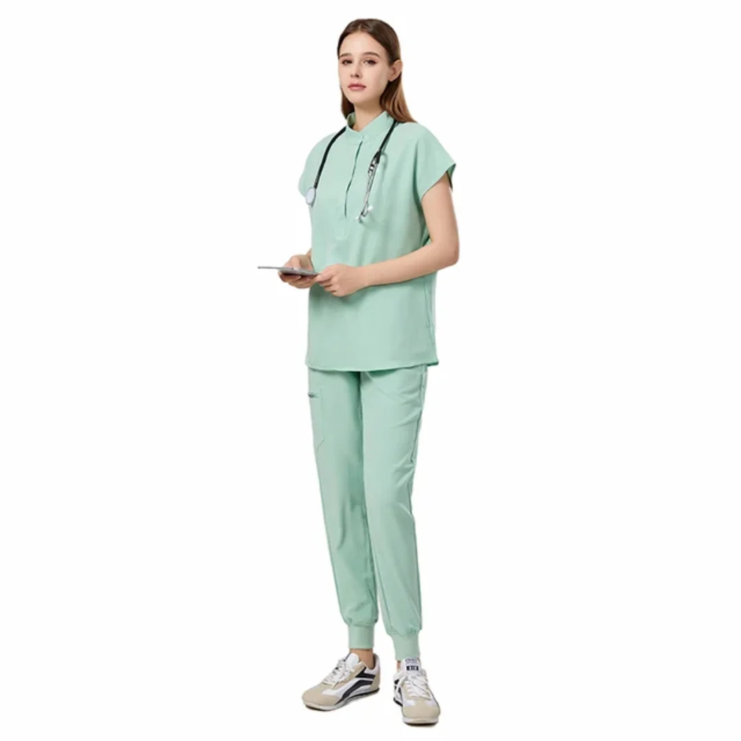 High Quality 2-Way Stretch Spandex V-Neck Hospital Scrubs for Women Short Sleeve Summer Medical Uniforms Wholesale