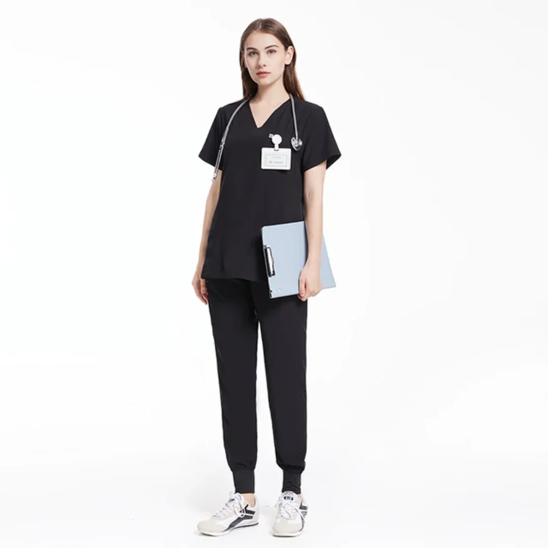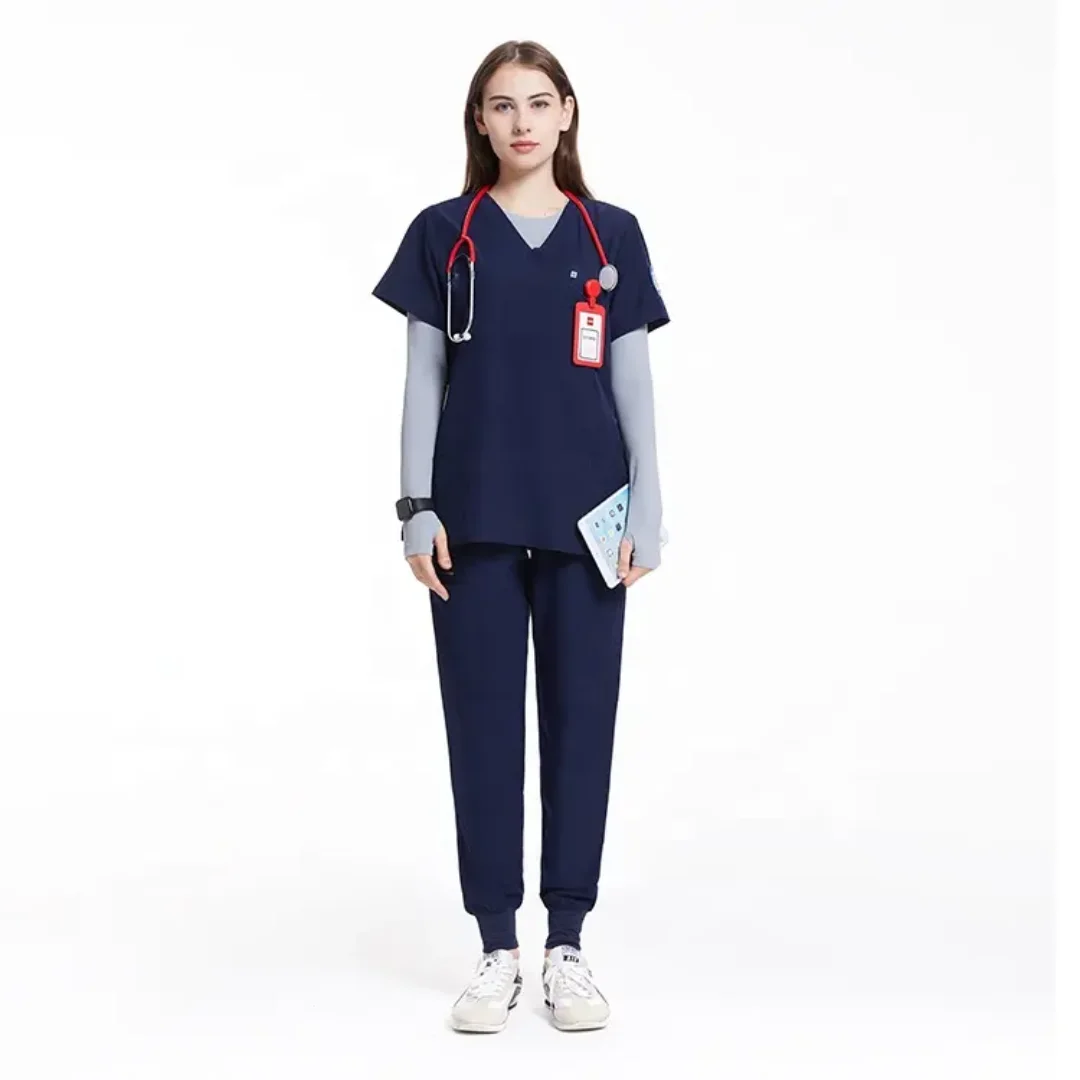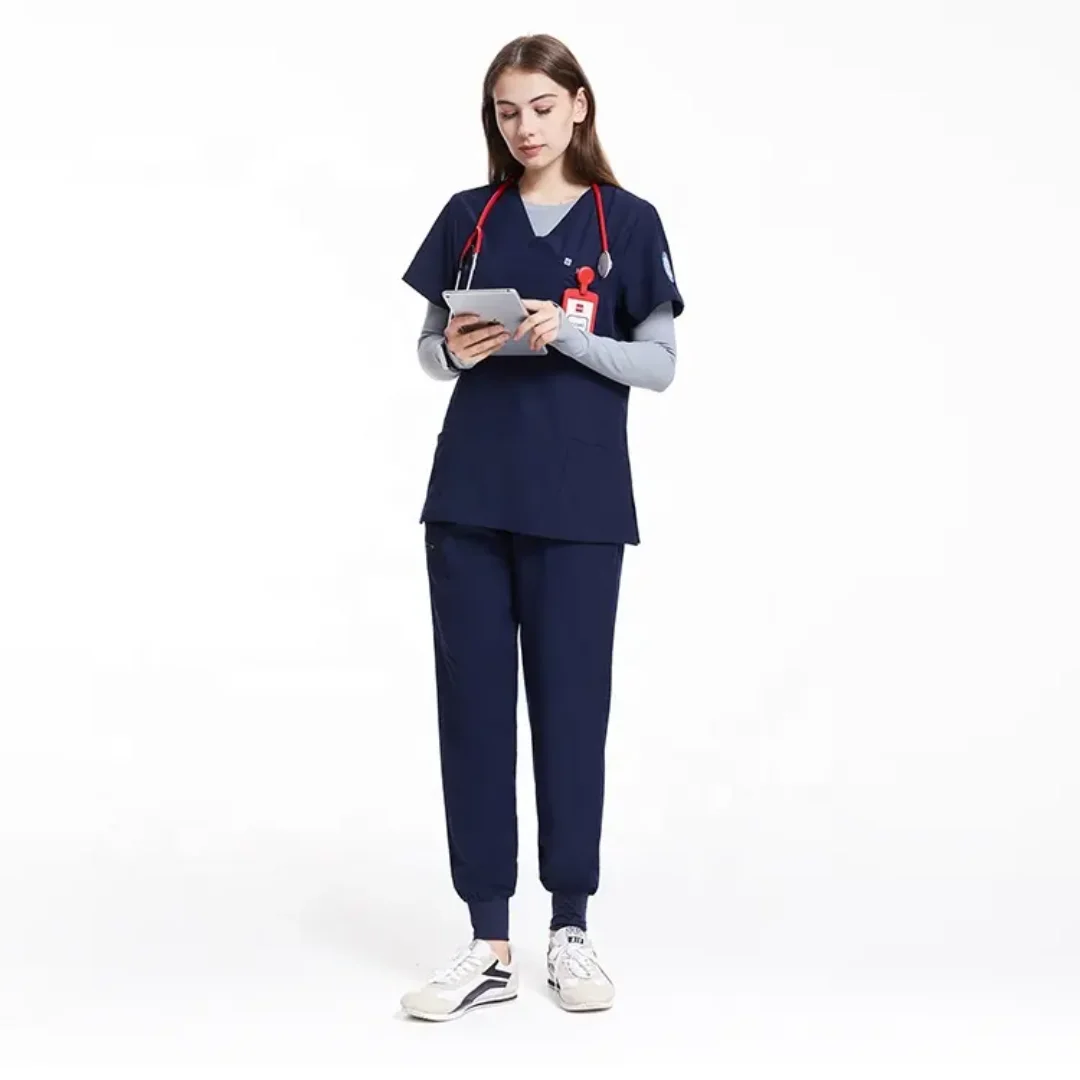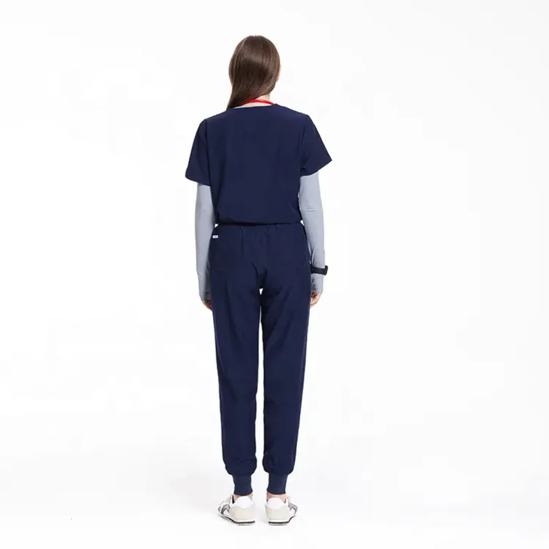 High Quality 4 Way V Neck Stretch Medical Scrub Uniforms Sets Dark Blue Anti-Bacterial Hospital Uniform