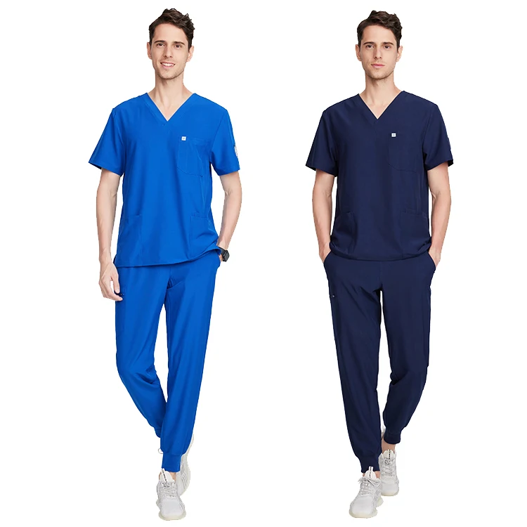 Men's Classic V-Neck Stretchy Top Jogger Pants Medical Scrub Sets Woven Fabric OEM Uniforms