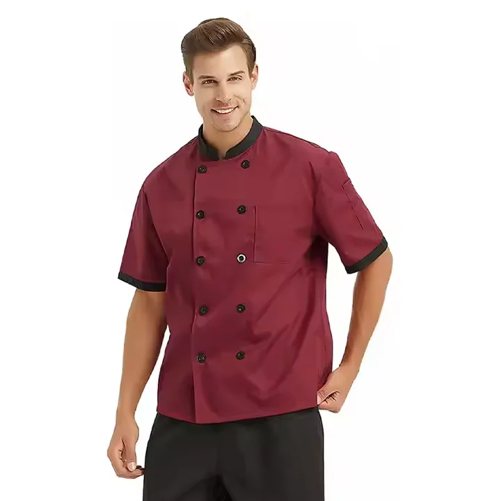 Custom Gray and Red Unisex Polyester Cotton Short Sleeve Chef Jacket Coat Uniform with Snaps Buttons Closure for Men
