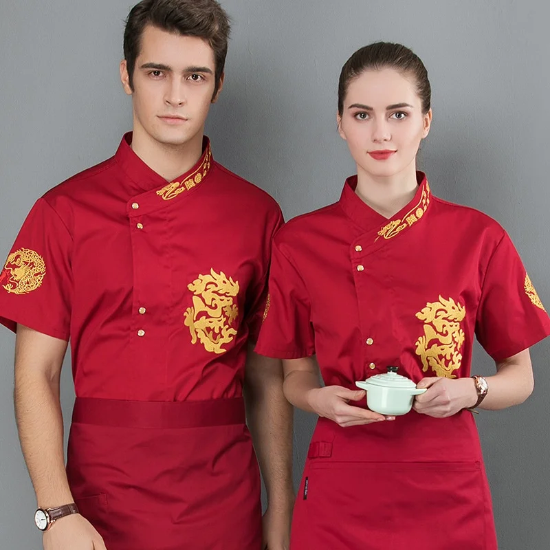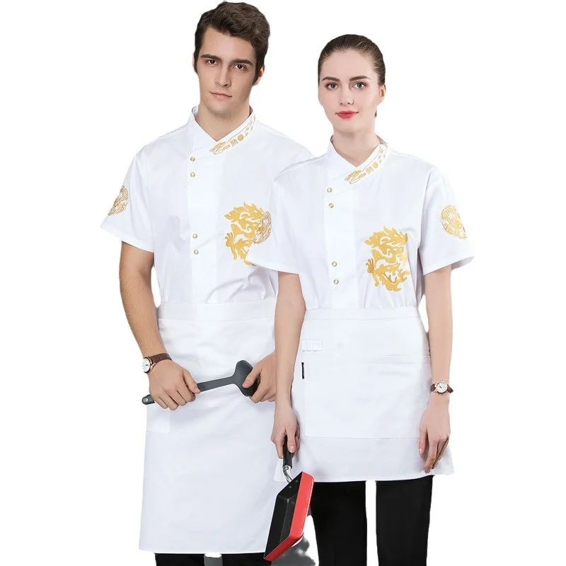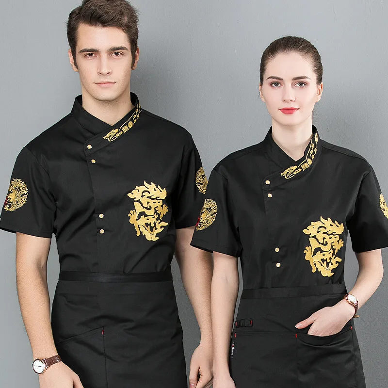 Men's Customized Short-Sleeved Cotton Workwear Chinese Style Embroidered Dragon Chef's Clothing Summer Breathable Hotel Uniform