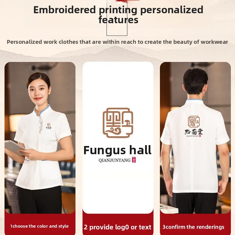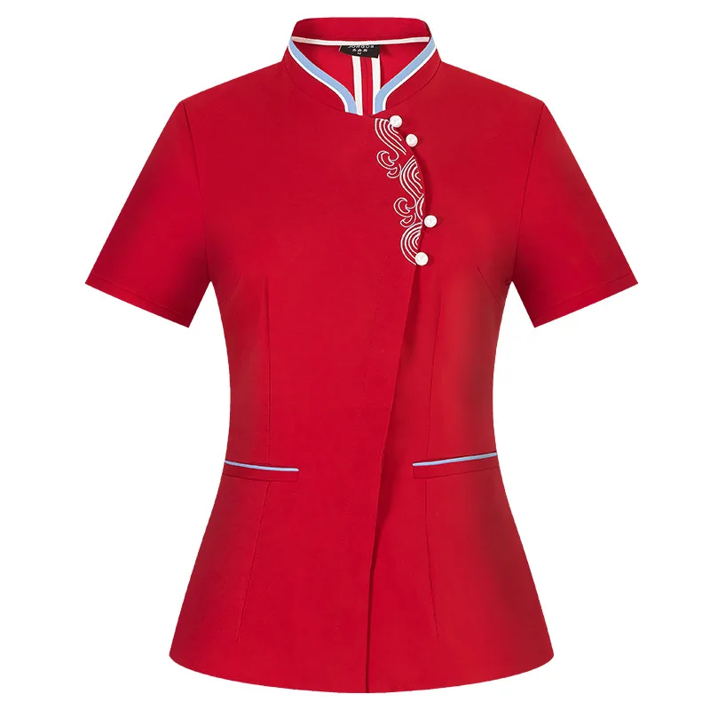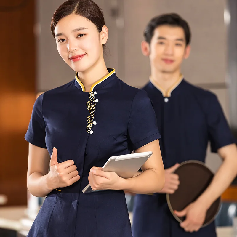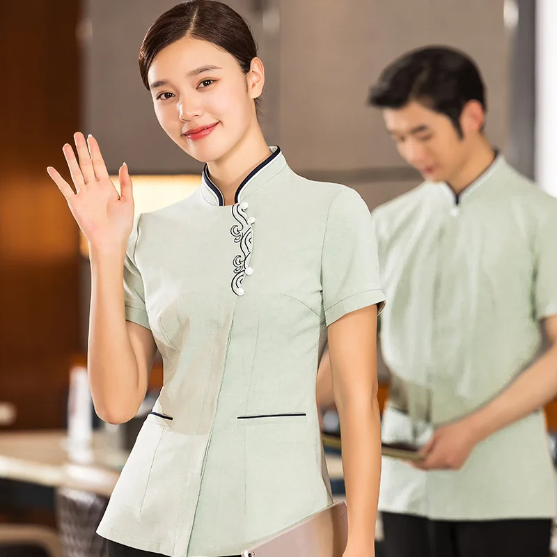Women's Mid-High End Summer Workwear Short Sleeve Front Desk Attire for Chinese Tea Restaurant & Hotel for Housekeeping Staff