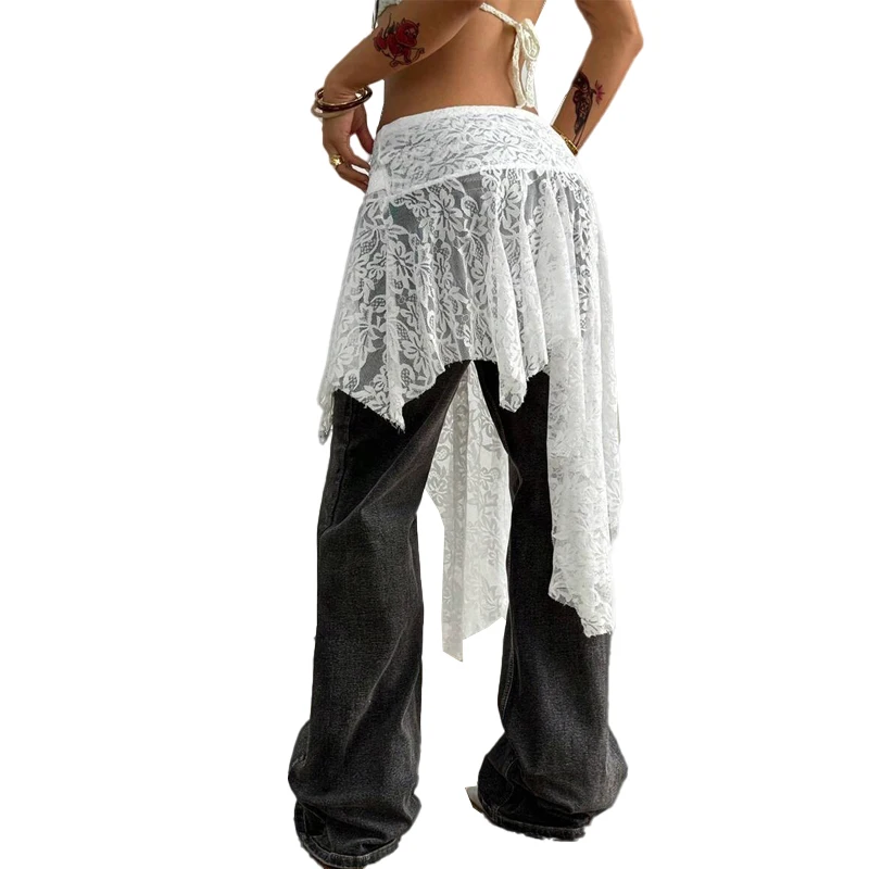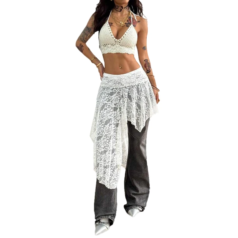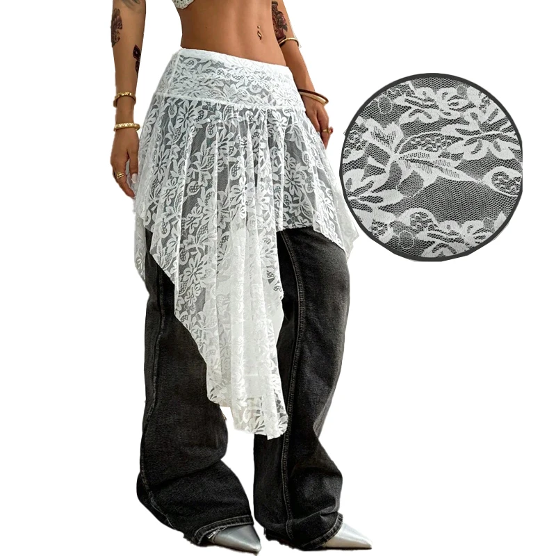 Women's Custom Summer Skirt - Western Streetwear Casual, White Lace See-Through with Asymmetrical Hem