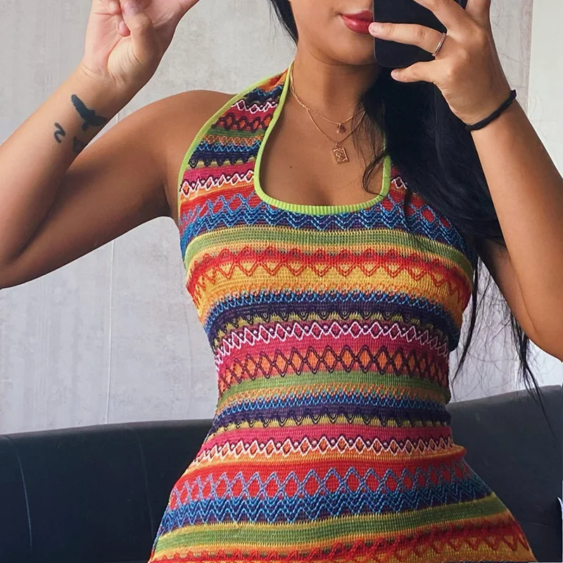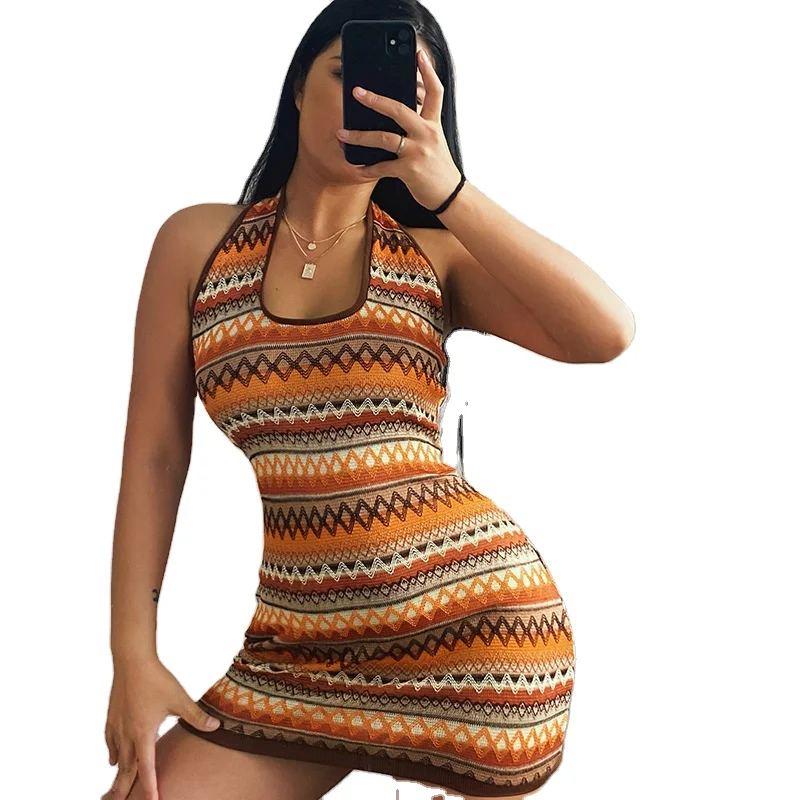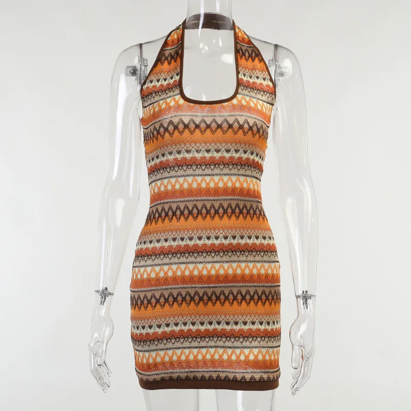 New Sexy Neckline Halter Skirt Striped Fashion Color Striped Neckline Dress