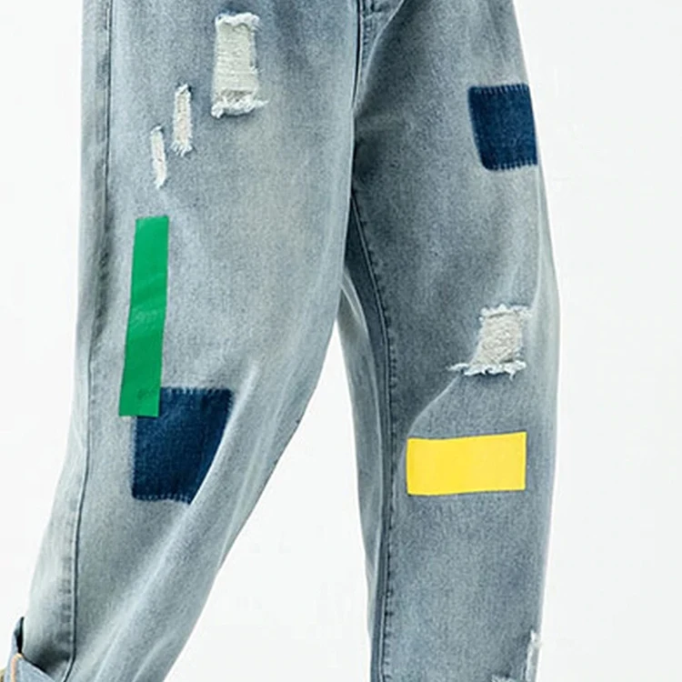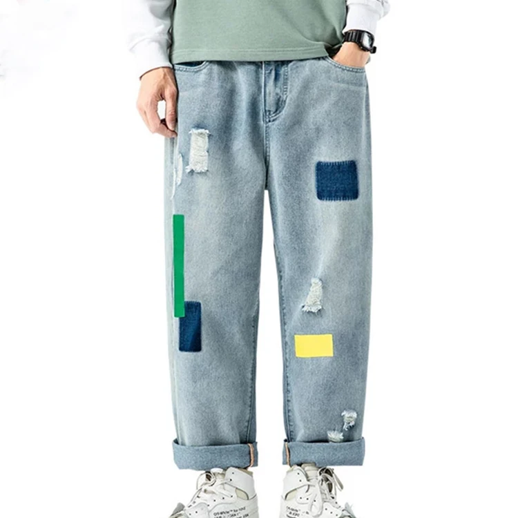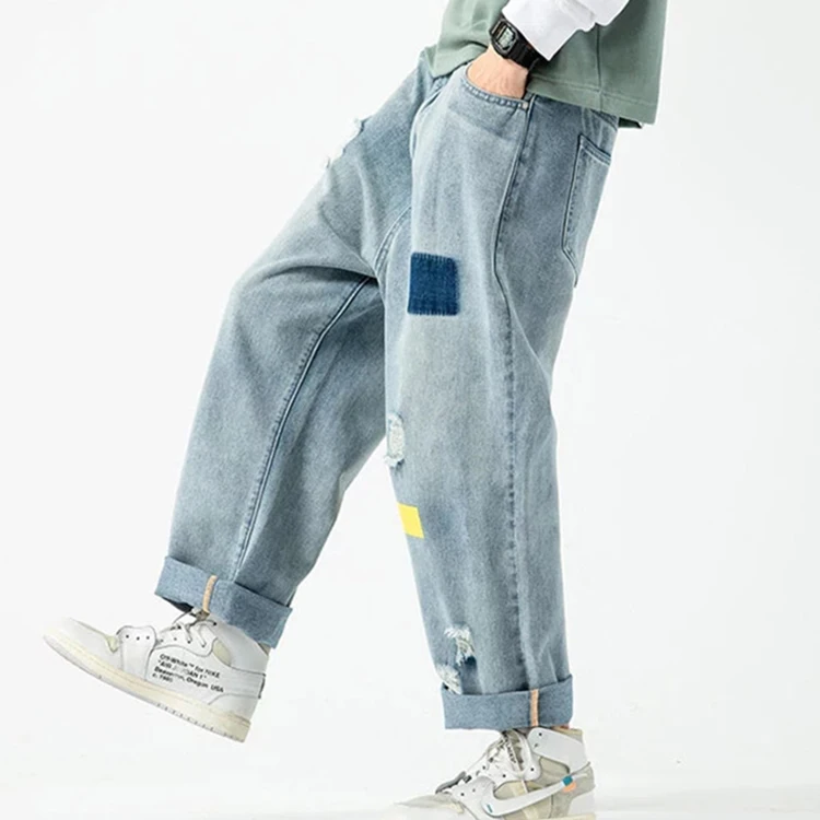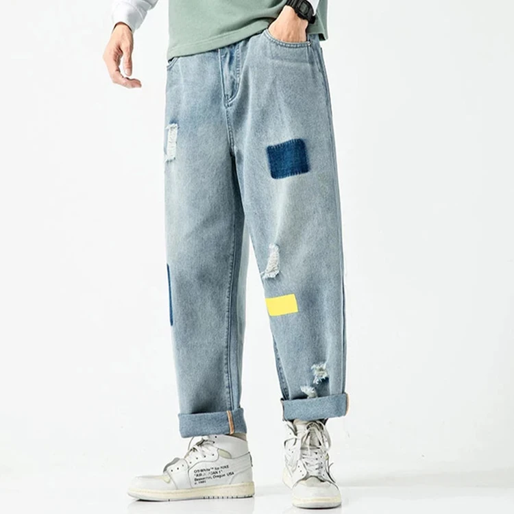 Custom Design Men's Straight Wide Leg 100% Cotton Hip Hop Jean Pants Breathable Embroidered Solid Pattern for Spring Winter