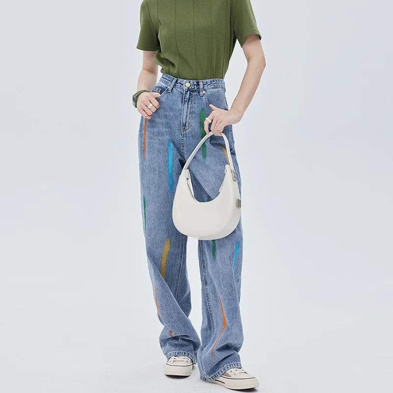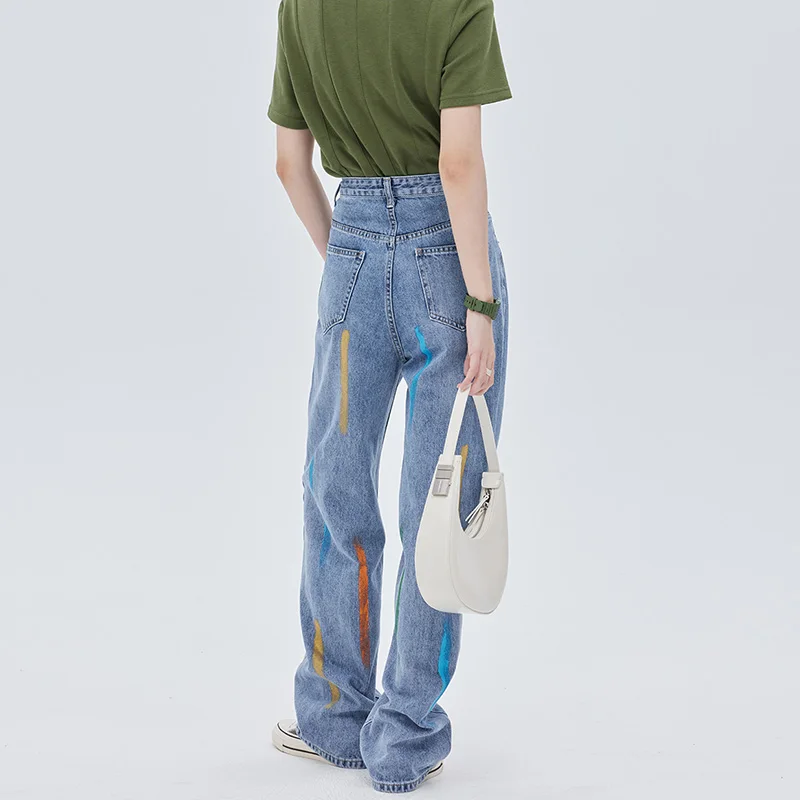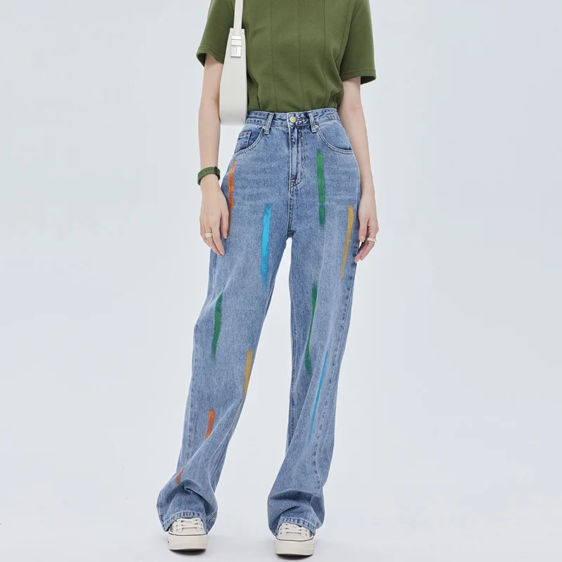 Custom Wholesale High Street Graffiti Jeans Women Pants Wide Leg Washing Denim Jean Pants for Ladies Parachute Pants Pantalones