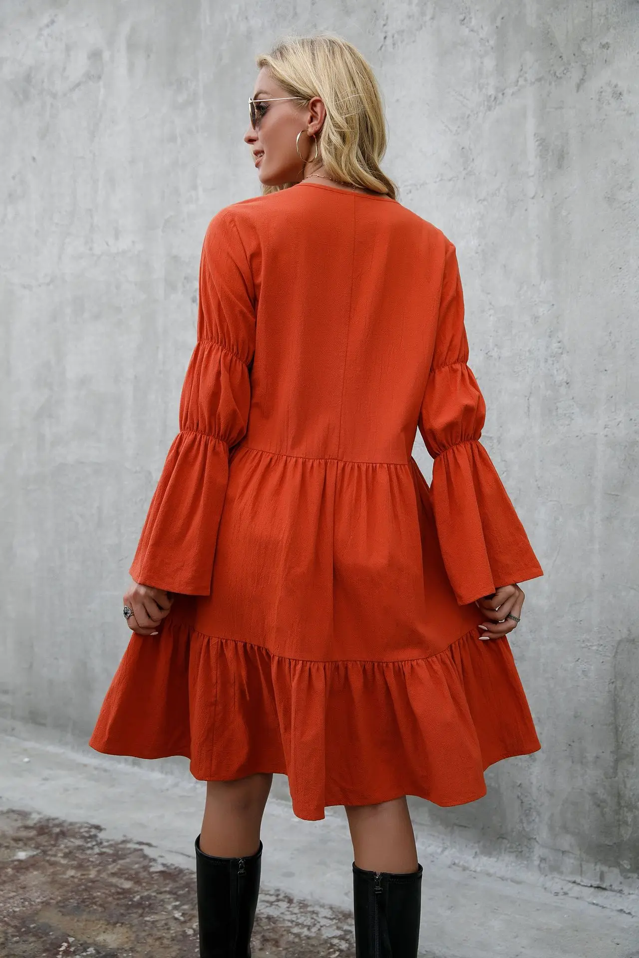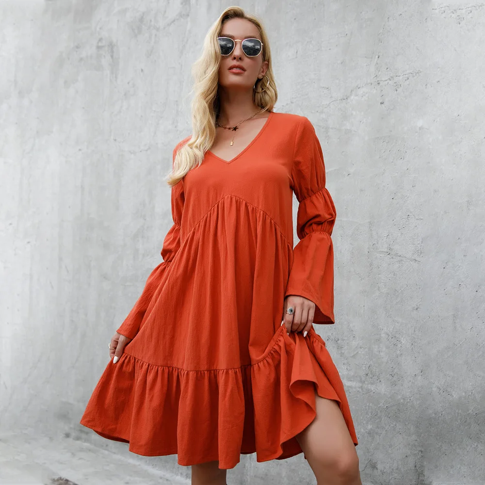 Fashion Summer Bohemian Style Dress Long Sleeve Ruffle Bottom Women Casual Loose Dress